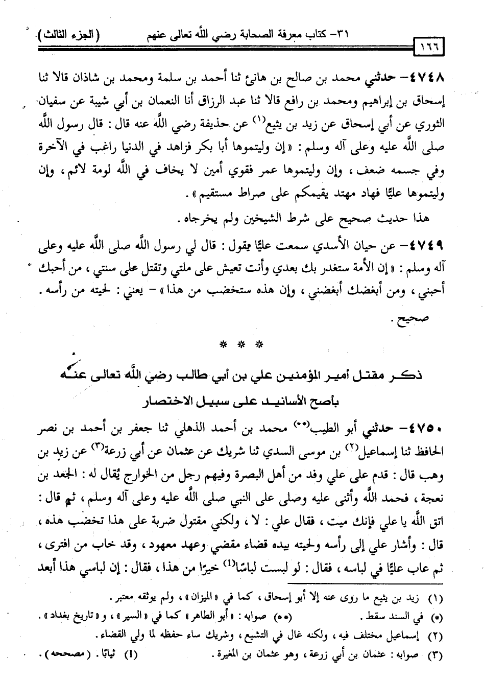 4748 - حَدَّثَنِي مُحَمَّدُ بْنُ صَالِحِ بْنِ هَانِئٍ ، ثنا أَحْمَدُ بْنُ سَلَمَةَ ، وَمُحَمَّدُ بْنُ شَاذَانَ ، قَالَا: ثنا إِسْحَاقُ بْنُ إِبْرَاهِيمَ ، وَمُحَمَّدُ بْنُ رَافِعٍ ، قَالَا: ثنا عَبْدُ الرَّزَّاقِ ، أَنَا النُّعْمَانُ بْنُ أَبِي شَيْبَةَ ، عَنْ سُفْيَانَ الثَّوْرِيِّ ، عَنْ أَبِي إِسْحَاقَ ، عَنْ زَيْدِ بْنِ يُثَيْعٍ ، عَنْ حُذَيْفَةَ رَضِيَ اللَّهُ عَنْهُ قَالَ: قَالَ رَسُولُ اللَّهِ صَلَّى اللَّهُ عَلَيْهِ وَسَلَّمَ: " إِنْ وَلَّيْتُمُوهَا أَبَا بَكْرٍ فَزَاهِدٌ فِي الدُّنْيَا ، رَاغِبٌ فِي الْآخِرَةِ ، وَفِي جِسْمِهِ ضَعْفٌ ، وَإِنْ وَلَّيْتُمُوهَا عُمَرُ فَقِوِيُّ أَمِينٌ ، لَا يَخَافُ فِي اللَّهِ لَوْمَةَ لَائِمٍ ، وَإِنْ وَلَّيْتُمُوهَا عَلِيًّا فَهَادٍ مُهْتَدٍ ، يُقِيمُكُمْ عَلَى صِرَاطٍ مُسْتَقِيمٍ "