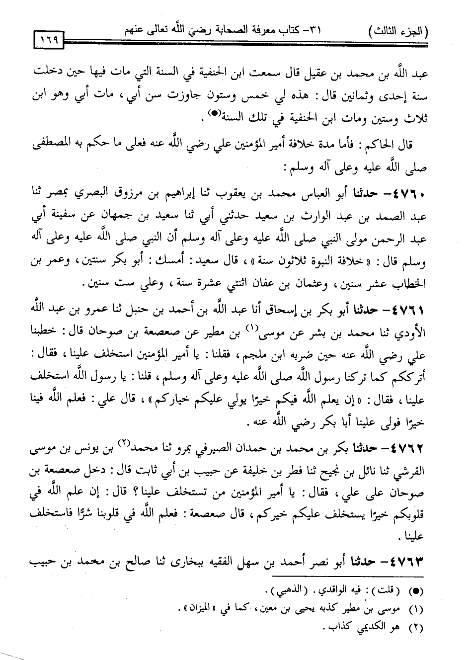 4760 - حَدَّثَنَا أَبُو الْعَبَّاسِ مُحَمَّدُ بْنُ يَعْقُوبَ ، ثنا إِبْرَاهِيمُ بْنُ مَرْزُوقٍ الْبَصْرِيُّ ، بِمِصْرَ ثنا عَبْدُ الصَّمَدِ بْنُ عَبْدِ الْوَارِثِ بْنِ سَعِيدٍ ، حَدَّثَنِي أَبِي ، ثنا سَعِيدُ بْنُ جُمْهَانَ ، عَنْ سَفِينَةَ أَبِي عَبْدِ الرَّحْمَنِ ، مَوْلَى النَّبِيِّ صَلَّى اللَّهُ عَلَيْهِ وَسَلَّمَ ، أَنَّ النَّبِيَّ صَلَّى اللَّهُ عَلَيْهِ وَسَلَّمَ قَالَ: " خِلَافَةُ النُّبُوَّةِ ثَلَاثُونَ سَنَةً " قَالَ سَعِيدٌ: " أَمْسَكَ أَبُو بَكْرٍ سَنَتَيْنِ ، وَعُمَرُ بْنُ الْخَطَّابِ عَشْرَ سِنِينَ ، وَعُثْمَانُ بْنُ عَفَّانَ اثْنَتَيْ عَشْرَةَ سَنَةً ، وَعَلِيٌّ سِتَّ سِنِينَ "