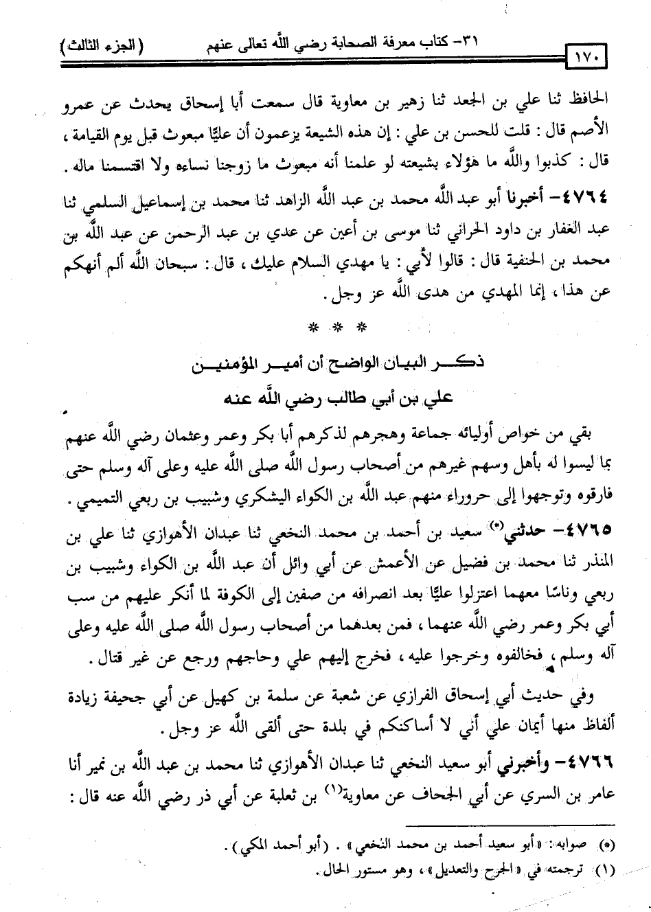 4765 - حَدَّثَنِي [أَبُو] سَعِيدٍ (بْنُ) أَحْمَدُ بْنُ مُحَمَّدٍ النَّخَعِيُّ ، ثنا عَبْدَانُ الْأَهْوَازِيُّ ، ثنا عَلِيُّ بْنُ الْمُنْذِرِ ، ثنا مُحَمَّدُ بْنُ فُضَيْلٍ ، عَنِ الْأَعْمَشِ ، عَنْ أَبِي وَائِلٍ ، أَنَّ عَبْدَ اللَّهِ بْنَ الْكَوَّاءِ ، وَشَبِيبَ بْنَ رِبْعِيٍّ وَنَاسًا مَعَهُمَا " اعْتَزَلُوا عَلِيًّا بَعْدَ انْصِرَافِهِ مِنْ صِفِّينَ إِلَى الْكُوفَةِ ، لِمَا أَنْكَرَ عَلَيْهِمْ مِنْ سَبِّ أَبِي بَكْرٍ وَعُمَرَ رَضِيَ اللَّهُ عَنْهُمَا ، فَمَنْ بَعْدَهُمَا مِنْ أَصْحَابِ رَسُولِ اللَّهِ صَلَّى اللَّهُ عَلَيْهِ وَسَلَّمَ ، فَخَالَفُوهُ وَخَرَجُوا عَلَيْهِ ، فَخَرَجَ إِلَيْهِمْ عَلِيٌّ وَحَاجَّهُمْ وَرَجَعَ عَنْ غَيْرِ قِتَالٍ "
