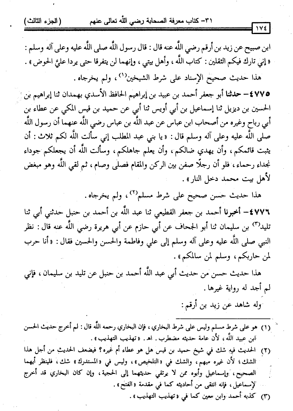 4775 - حَدَّثَنَا أَبُو جَعْفَرٍ أَحْمَدُ بْنُ عُبَيْدِ بْنِ إِبْرَاهِيمَ الْحَافِظُ الْأَسَدِيُّ ، بِهَمْدَانَ ، ثنا إِبْرَاهِيمُ بْنُ الْحُسَيْنِ بْنِ دِيزِيلَ ، ثنا إِسْمَاعِيلُ بْنُ أَبِي أُوَيْسٍ ، ثنا أَبِي ، عَنْ حُمَيْدِ بْنِ قَيْسٍ الْمَكِّيِّ ، عَنْ عَطَاءِ بْنِ أَبِي رَبَاحٍ ، وَغَيْرِهِ مِنْ أَصْحَابِ ابْنِ عَبَّاسٍ ، عَنْ عَبْدِ اللَّهِ بْنِ عَبَّاسٍ رَضِيَ اللَّهُ عَنْهُمَا ، أَنَّ رَسُولَ اللَّهِ صَلَّى اللَّهُ عَلَيْهِ وَسَلَّمَ قَالَ : " يَا بَنِي عَبْدِ الْمُطَّلِبِ ، إِنِّي سَأَلْتُ اللَّهَ لَكُمْ ثَلَاثًا : أَنْ يُثَبِّتُ قَائِمَكُمْ ، وَأَنْ يَهْدِيَ ضَالَّكُمْ ، وَأَنْ يُعَلِّمَ جَاهِلَكُمْ ، وَسَأَلْتُ اللَّهَ أَنْ يَجْعَلَكُمْ جُوَدَاءَ نُجَدَاءَ رُحَمَاءَ ، فَلَوْ أَنَّ رَجُلًا صَفَنَ بَيْنَ الرُّكْنِ وَالْمَقَامِ فَصَلَّى ، وَصَامَ ثُمَّ لَقِيَ اللَّهَ وَهُوَ مُبْغِضٌ لِأَهْلِ بَيْتِ مُحَمَّدٍ دَخَلَ النَّارَ "