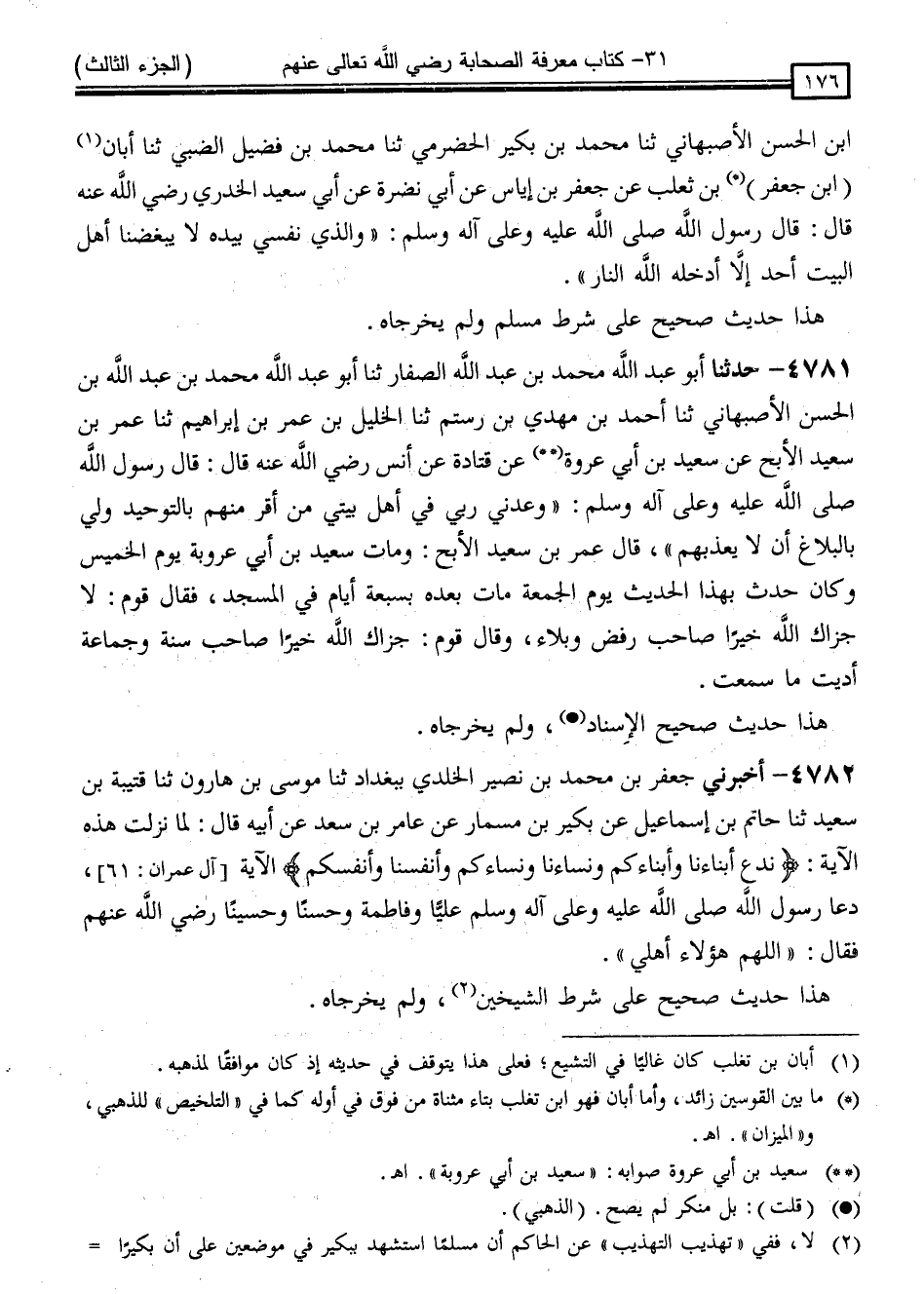 4781 - حَدَّثَنَا أَبُو عَبْدِ اللَّهِ مُحَمَّدُ بْنُ عَبْدِ اللَّهِ الصَّفَّارُ ، (ثنا أَبُو عَبْدِ اللَّهِ مُحَمَّدُ بْنُ عَبْدِ اللَّهِ بْنِ الْحَسَنِ الْأَصْبَهَانِيُّ) ، ثنا أَحْمَدُ بْنُ مَهْدِيِّ بْنِ رُسْتُمٍ ، ثنا الْخَلِيلُ بْنُ عُمَرَ بْنِ إِبْرَاهِيمَ ، ثنا عُمَرُ بْنُ سَعِيدٍ الْأَبَحُّ ، عَنْ سَعِيدِ بْنِ أَبِي عُرْوَةَ * ، عَنْ قَتَادَةَ ، عَنْ أَنَسٍ رَضِيَ اللَّهُ عَنْهُ قَالَ: قَالَ رَسُولُ اللَّهِ صَلَّى اللَّهُ عَلَيْهِ وَسَلَّمَ: " وَعَدَنِي رَبِّي فِي أَهْلِ بَيْتِي مَنْ أَقَرَّ مِنْهُمْ بِالتَّوْحِيدِ ، وَلِي بِالْبَلَاغِ أَنْ لَا يُعَذِّبَهُمْ " قَالَ عُمَرُ بْنُ سَعِيدٍ الْأَبَحُّ: " وَمَاتَ سَعِيدُ بْنُ أَبِي عَرُوبَةَ يَوْمَ الْخَمِيسِ ، وَكَانَ حَدَّثَ بِهَذَا الْحَدِيثِ يَوْمَ الْجُمُعَةِ ، مَاتَ بَعْدَهُ بِسَبْعَةِ أَيَّامٍ فِي الْمَسْجِدِ ، فَقَالَ قَوْمٌ: لَا جَزَاكَ اللَّهُ خَيْرًا صَاحِبَ رَفْضٍ ** وَبَلَاءٍ ، وَقَالَ قَوْمٌ: جَزَاكَ اللَّهُ خَيْرًا صَاحِبَ سُنَّةٍ وَجَمَاعَةٍ أَدَّيْتَ مَا سَمِعْتَ "