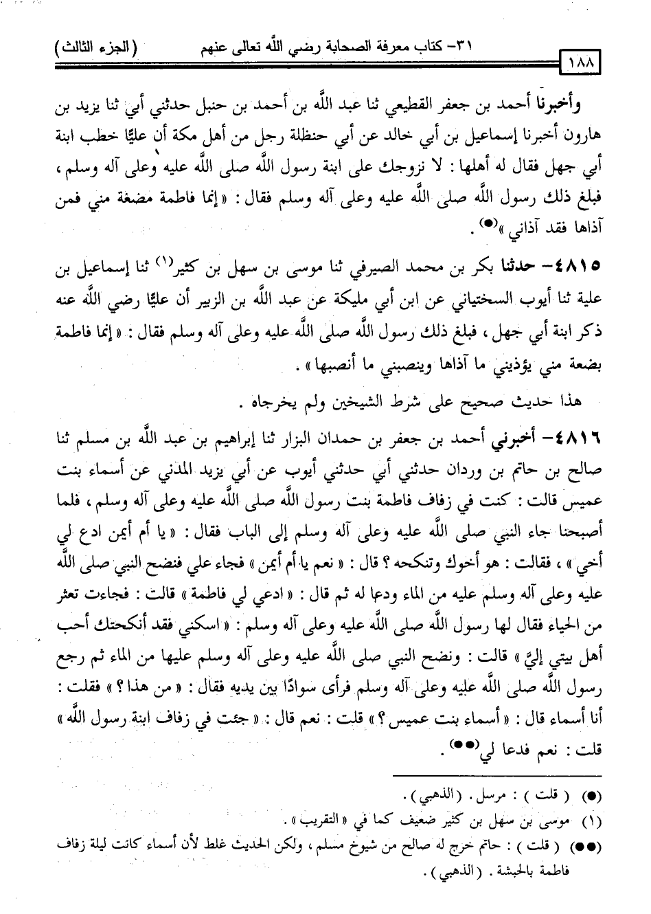 4816 - أَخْبَرَنِي أَحْمَدُ بْنُ جَعْفَرِ بْنِ حَمْدَانَ الْبَزَّارُ ، ثنا إِبْرَاهِيمُ بْنُ عُبَيْدِ اللَّهِ * بْنِ مُسْلِمٍ ، ثنا صَالِحُ بْنُ حَاتِمِ بْنِ وَرْدَانَ ، حَدَّثَنِي أَبِي ، حَدَّثَنِي أَيُّوبَ ، عَنْ أَبِي يَزِيدَ الْمَدَنِيِّ ، عَنْ أَسْمَاءَ بِنْتِ عُمَيْسٍ قَالَتْ: كُنْتُ فِي زِفَافِ فَاطِمَةَ بِنْتِ رَسُولِ اللَّهِ صَلَّى اللَّهُ عَلَيْهِ وَسَلَّمَ ، فَلَمَّا أَصْبَحْنَا جَاءَ النَّبِيُّ صَلَّى اللَّهُ عَلَيْهِ وَسَلَّمَ إِلَى الْبَابِ ، فَقَالَ: " يَا أُمَّ أَيْمَنَ ، ادْعِي لِي أَخِي " فَقَالَتْ: هُوَ أَخُوكَ وَتُنْكِحُهُ ، قَالَ: " نَعَمْ ، يَا أُمَّ أَيْمَنَ " فَجَاءَ عَلِيٌّ ، فَنَضَحَ النَّبِيَّ صَلَّى اللَّهُ عَلَيْهِ وَسَلَّمَ عَلَيْهِ مِنَ الْمَاءِ وَدَعَا لَهُ ، ثُمَّ قَالَ: " ادْعِي لِي فَاطِمَةَ " قَالَتْ: فَجَاءَتْ تَعْثُرُ مِنَ الْحَيَاءِ ، فَقَالَ لَهَا رَسُولُ اللَّهِ صَلَّى اللَّهُ عَلَيْهِ وَسَلَّمَ: " اسْكُنِي ، فَقَدْ أَنْكَحْتُكِ أَحَبَّ أَهْلِ بَيْتِي إِلَيَّ " قَالَتْ: وَنَضَحَ النَّبِيُّ صَلَّى اللَّهُ عَلَيْهِ وَسَلَّمَ عَلَيْهَا مِنَ الْمَاءِ ، ثُمَّ رَجَعَ رَسُولُ اللَّهِ صَلَّى اللَّهُ عَلَيْهِ وَسَلَّمَ فَرَأَى سَوَادًا بَيْنَ يَدَيْهِ ، فَقَالَ: " مَنْ هَذَا ؟ " فَقُلْتُ: أَنَا أَسْمَاءُ بِنْتُ عُمَيْسٍ قُلْتُ: نَعَمْ ، قَالَ: " جِئْتِ فِي زِفَافِ ابْنَةِ رَسُولِ اللَّهِ ؟ " قُلْتُ: نَعَمْ ، فَدَعَا لِي