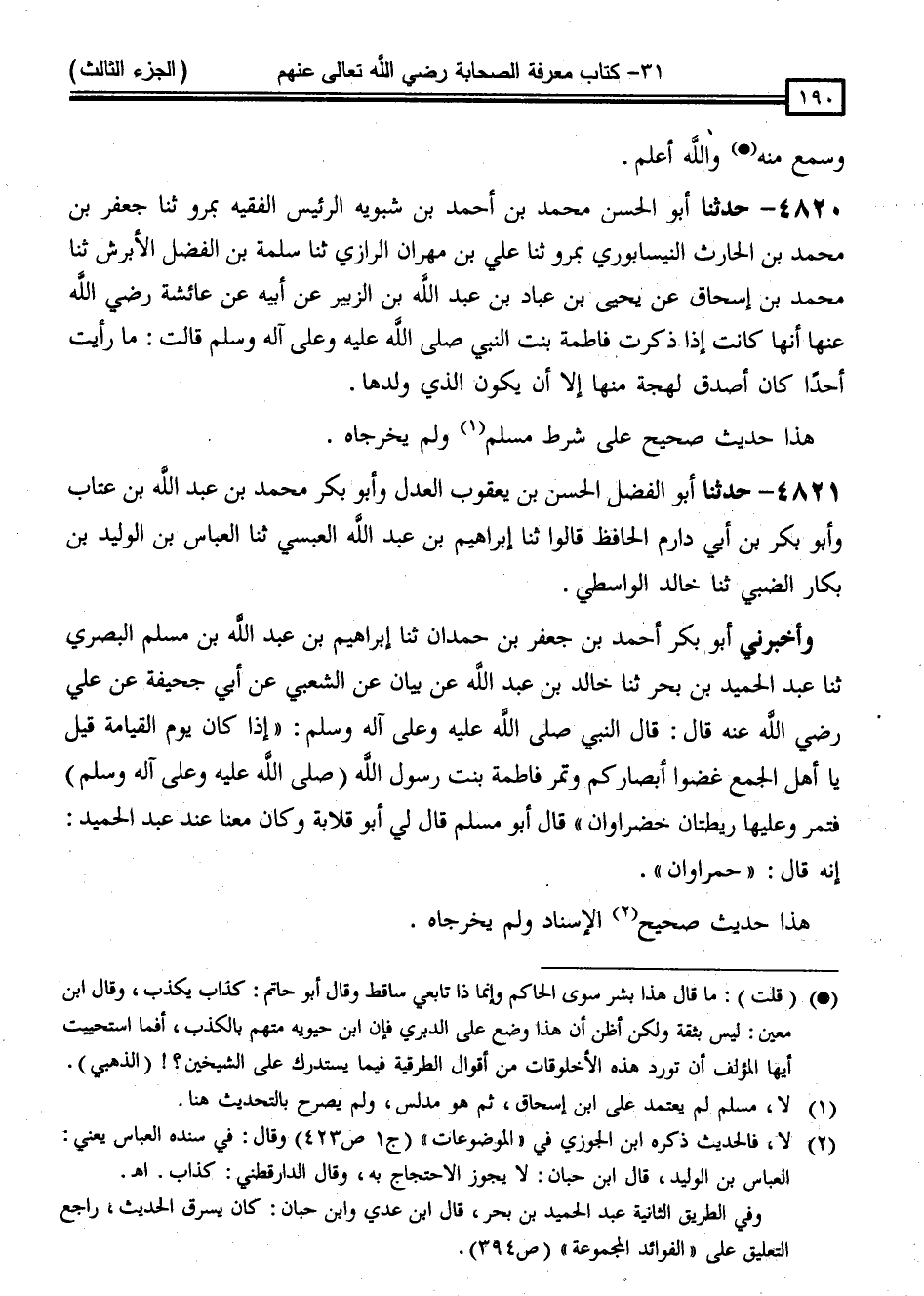 وَأَخْبَرَنِي أَبُو بَكْرٍ أَحْمَدُ بْنُ جَعْفَرِ بْنِ حَمْدَانَ ، ثنا إِبْرَاهِيمُ بْنُ عَبْدِ اللَّهِ بْنِ مُسْلِمٍ الْبَصْرِيُّ ، ثنا عَبْدِ الْحَمِيدِ بْنُ بَحْرٍ ، ثنا خَالِدُ بْنُ عَبْدِ اللَّهِ ، عَنْ بَيَانَ ، عَنِ الشَّعْبِيِّ ، عَنْ أَبِي جُحَيْفَةَ ، عَنْ عَلِيٍّ رَضِيَ اللَّهُ عَنْهُ قَالَ: قَالَ النَّبِيُّ صَلَّى اللَّهُ عَلَيْهِ وَسَلَّمَ: " إِذَا كَانَ يَوْمُ الْقِيَامَةِ قِيلَ: يَا أَهْلَ الْجَمْعِ غُضُّوا أَبْصَارَكُمْ لِتَمُرَّ فَاطِمَةُ بِنْتُ رَسُولِ اللَّهِ صَلَّى اللَّهُ عَلَيْهِ وَسَلَّمَ ، فَتَمُرُّ وَعَلَيْهَا رَيْطَتَانِ خَضْرَاوَانِ " قَالَ: أَبُو مُسْلِمٍ: قَالَ لِي أَبُو قِلَابَةَ وَكَانَ مَعَنَا عَبْدُ الْحَمِيدِ أَنَّهُ قَالَ: " حَمْرَاوَانِ "