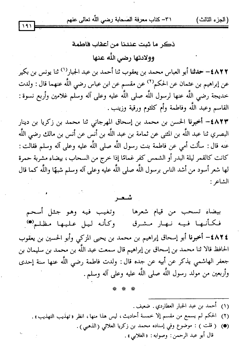 4824 - أَخْبَرَنَا أَبُو إِسْحَاقَ إِبْرَاهِيمُ بْنُ مُحَمَّدِ بْنِ يَحْيَى الْمُزَكِّي ، وَأَبُو الْحُسَيْنِ بْنُ يَعْقُوبَ الْحَافِظُ قَالَا: ثنا مُحَمَّدُ بْنُ إِسْحَاقَ بْنِ إِبْرَاهِيمَ ، قَالَ: سَمِعْتُ عَبْدَ اللَّهِ بْنَ مُحَمَّدِ بْنِ سُلَيْمَانَ بْنِ جَعْفَرٍ الْهَاشِمِيَّ يَذْكُرُ ، عَنْ أَبِيهِ ، عَنْ جَدِّهِ قَالَ: " وُلِدَتْ فَاطِمَةُ رَضِيَ اللَّهُ عَنْهَا سَنَةَ إِحْدَى وَأَرْبَعِينَ مِنْ مَوْلِدِ رَسُولِ اللَّهِ صَلَّى اللَّهُ عَلَيْهِ وَسَلَّمَ "