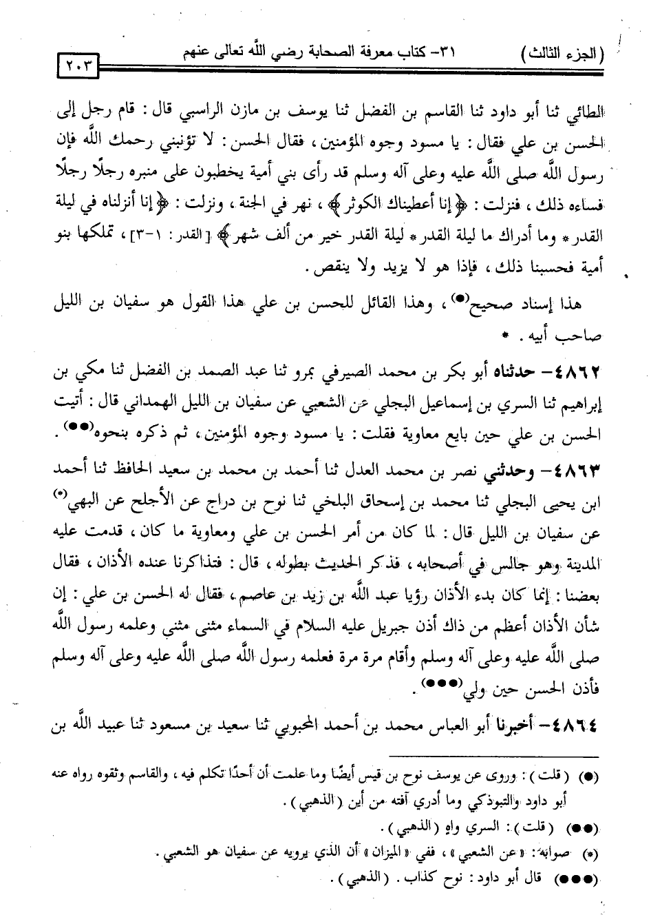 4863 - وَحَدَّثَنِي نَصْرُ بْنُ مُحَمَّدٍ الْعَدْلُ ، ثنا أَحْمَدُ بْنُ مُحَمَّدِ بْنِ سَعِيدٍ الْحَافِظُ ، ثنا أَحْمَدُ بْنُ يَحْيَى الْبَجَلِيُّ ، ثنا مُحَمَّدُ بْنُ إِسْحَاقَ الْبَلْخِيُّ ، ثنا نُوحُ بْنُ دَرَّاجٍ ، عَنِ الْأَجْلَحِ ، عَنِ الْبَهِيِّ * ، عَنْ سُفْيَانَ بْنِ اللَّيْلِ ، قَالَ: لَمَّا كَانَ مِنْ أَمْرِ الْحَسَنِ بْنِ عَلِيٍّ وَمُعَاوِيَةَ مَا كَانَ قَدِمْتُ عَلَيْهِ الْمَدِينَةَ وَهُوَ جَالِسٌ فِي أَصْحَابِهِ ، - فَذَكَرَ الْحَدِيثَ بِطُولِهِ - قَالَ: فَتَذَاكَرْنَا عِنْدَهُ الْأَذَانَ فَقَالَ بَعْضُنَا: إِنَّمَا كَانَ بَدْءُ الْأَذَانِ رُؤْيَا عَبْدِ اللَّهِ بْنِ زَيْدِ بْنِ عَاصِمٍ ، فَقَالَ لَهُ الْحَسَنُ بْنُ عَلِيٍّ: " إِنَّ شَأْنَ الْأَذَانِ أَعْظَمُ مِنْ ذَاكَ ، أَذَّنَ جِبْرِيلُ عَلَيْهِ السَّلَامُ فِي السَّمَاءِ مَثْنَى مَثْنَى ، وَعَلَّمَهُ رَسُولَ اللَّهِ صَلَّى اللَّهُ عَلَيْهِ وَسَلَّمَ ، وَأَقَامُ مَرَّةً مَرَّةً فَعَلَّمَهُ رَسُولَ اللَّهِ صَلَّى اللَّهُ عَلَيْهِ وَسَلَّمَ فَأَذَّنَ الْحَسَنُ حِينَ وَلِيَ "