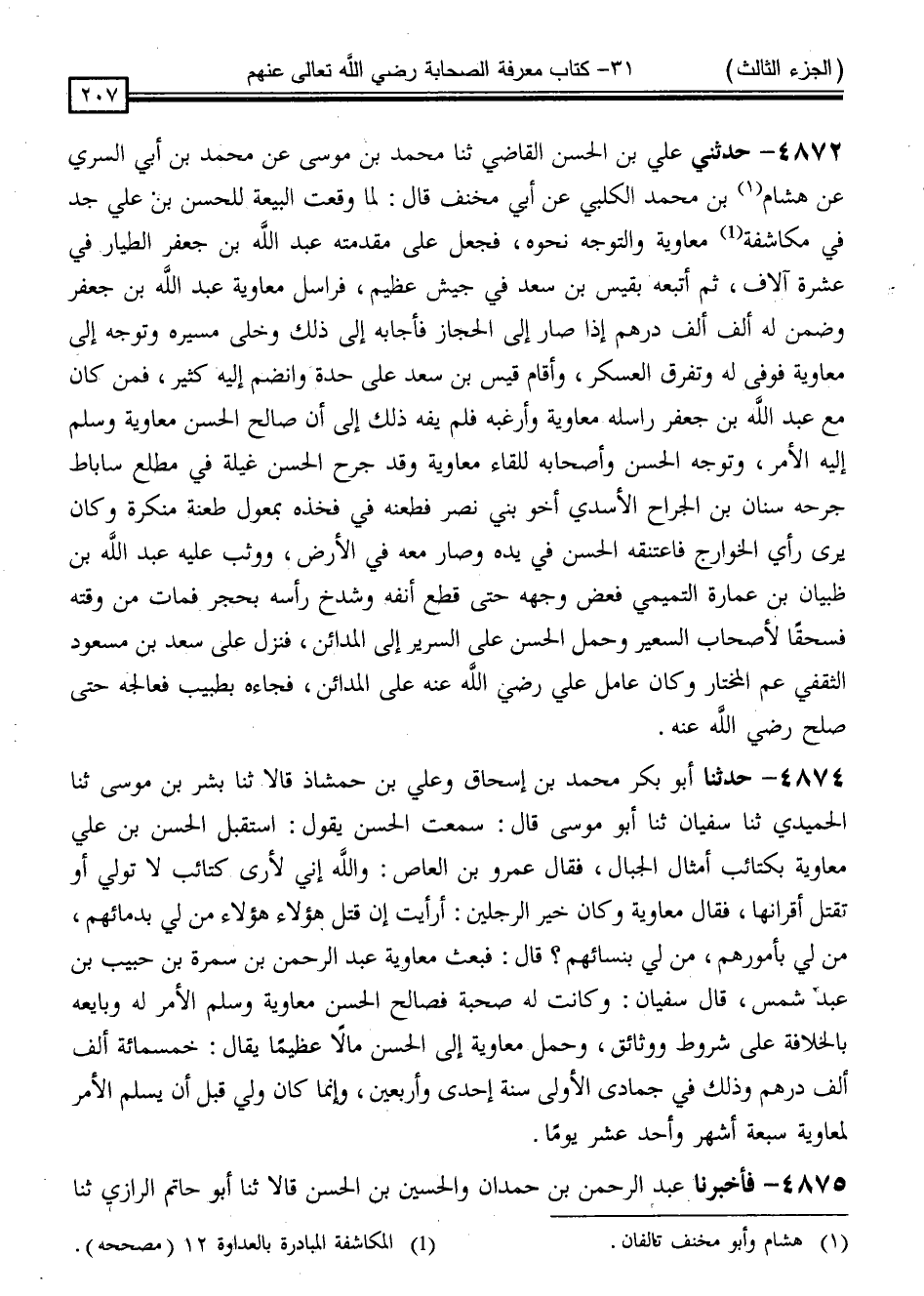 4873 - حَدَّثَنِي عَلِيُّ بْنُ الْحَسَنِ الْقَاضِي ، ثنا مُحَمَّدُ بْنُ مُوسَى ، عَنْ مُحَمَّدِ بْنِ أَبِي السَّرِيِّ ، عَنْ هِشَامِ بْنِ مُحَمَّدِ بْنِ الْكَلْبِيِّ ، عَنْ أَبِي مِخْنَفٍ قَالَ: " لَمَّا وَقَعَتِ الْبَيْعَةُ لِلْحَسَنِ بْنِ عَلِيٍّ جَدَّ فِي مُكَاشَفَةِ مُعَاوِيَةَ وَالتَّوَجُّهِ نَحْوَهُ ، فَجَعَلَ عَلَى مُقَدِّمَتِهِ عَبْدَ اللَّهِ بْنَ جَعْفَرٍ الطَّيَّارِ فِي عَشْرَةِ آلَافٍ ، ثُمَّ أَتْبَعَهُ بِقَيْسِ بْنِ سَعْدٍ فِي جَيْشٍ عَظِيمٍ ، فَرَاسَلَ مُعَاوِيَةُ عَبْدَ اللَّهِ بْنَ جَعْفَرٍ ، وَضَمِنَ لَهُ أَلْفَ أَلْفَ دِرْهَمٍ إِذَا صَارَ إِلَى الْحِجَازِ ، فَأَجَابَهُ إِلَى ذَلِكَ وَخَلَّى مَسِيرَهُ ، وَتَوَجَّهَ إِلَى مُعَاوِيَةَ فَوَفَّى لَهُ ، وَتَفَرَّقَ الْعَسْكَرُ وَأَقَامَ قَيْسُ بْنُ سَعْدٍ عَلَى حِدَةٍ ، وَانْضَمَّ إِلَيْهِ كَثِيرٌ ، فَمَنْ كَانَ مَعَ عَبْدِ اللَّهِ بْنِ جَعْفَرٍ رَاسَلَهُ مُعَاوِيَةُ وَأَرْغَبَهُ فَلَمْ يَفِهِ ذَلِكَ إِلَى أَنْ صَالَحَ الْحَسَنُ مُعَاوِيَةَ وَسَلَّمَ إِلَيْهِ الْأَمْرَ وَتَوَجَّهَ الْحَسَنُ وَأَصْحَابُهُ لِلِقَاءِ مُعَاوِيَةَ وَقَدْ جُرِحَ الْحَسَنُ غِيلَةً فِي مَطْلَعِ سَابَاطَ جَرَحَهُ سِنَانُ بْنُ الْجَرَّاحِ الْأَسَدِيُّ أَخُو بَنِي نَصْرٍ ، فَطَعَنَهُ فِي فَخِذِهِ بِمِعْوَلٍ طَعْنَةً مُنْكَرَةً ، وَكَانَ يَرَى رَأْيَ الْخَوَارِجِ ، فَاعْتَنَقَهُ الْحَسَنُ فِي يَدِهِ وَصَارَ مَعَهُ فِي الْأَرْضِ ، وَوَثَبَ عَلَيْهِ عَبْدُ اللَّهِ بْنُ ظَبْيَانَ بْنِ عُمَارَةَ التَّمِيمِيُّ فَعَضَّ وَجْهَهُ حَتَّى قَطَعَ أَنْفَهُ وَشَدَخَ رَأْسَهُ بِحَجَرٍ ، فَمَاتَ مِنْ وَقْتِهِ فَسُحْقًا لِأَصْحَابِ السَّعِيرِ ، وَحُمِلَ الْحَسَنُ عَلَى السَّرِيرِ إِلَى الْمَدَائِنِ ، فَنَزَلَ عَلَى سَعْدِ بْنِ مَسْعُودٍ الثَّقَفِيِّ عَمِّ الْمُخْتَارِ ، وَكَانَ عَامِلَ عَلِيٍّ رَضِيَ اللَّهُ عَنْهُ عَلَى الْمَدَائِنِ فَجَاءَهُ بِطَبِيبٍ فَعَالَجَهُ حَتَّى صَلُحَ رَضِيَ اللَّهُ عَنْهُ "
