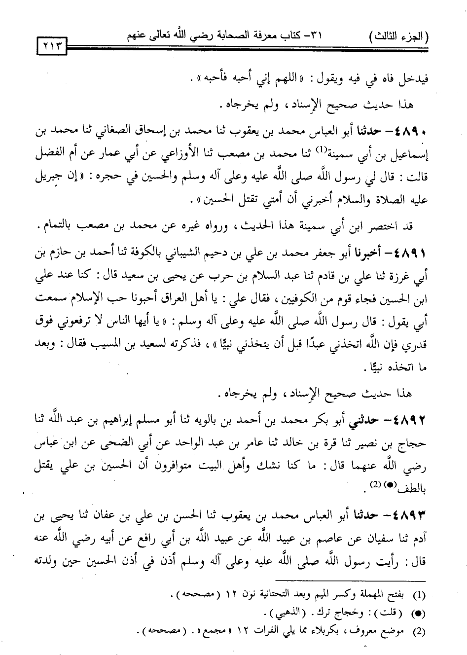 4890 - حَدَّثَنَا أَبُو الْعَبَّاسِ مُحَمَّدُ بْنُ يَعْقُوبَ ، ثنا مُحَمَّدُ بْنُ إِسْحَاقَ الصَّغَانِيُّ ، ثنا مُحَمَّدُ بْنُ إِسْمَاعِيلَ بْنِ أَبِي سَمِينَةَ ، ثنا مُحَمَّدُ بْنُ مُصْعَبٍ ، ثنا الْأَوْزَاعِيُّ ، عَنْ أَبِي عَمَّارٍ ، عَنْ أُمِّ الْفَضْلِ قَالَتْ: قَالَ لِي رَسُولُ اللَّهِ صَلَّى اللَّهُ عَلَيْهِ وَسَلَّمَ وَالْحُسَيْنُ فِي حِجْرِهِ: " إِنَّ جِبْرِيلَ عَلَيْهِ الصَّلَاةُ وَالسَّلَامُ أَخْبَرَنِي: إِنَّ أُمَّتِي تَقْتُلُ الْحُسَيْنَ "
