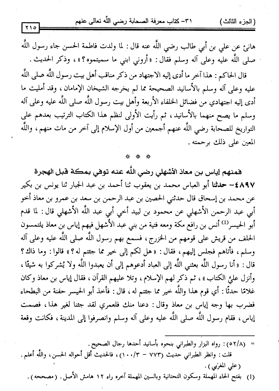 4897 - حَدَّثَنَا أَبُو الْعَبَّاسِ مُحَمَّدُ بْنُ يَعْقُوبَ ، ثنا أَحْمَدُ بْنُ عَبْدِ الْجَبَّارِ ، ثنا يُونُسُ بْنُ بُكَيْرٍ ، عَنْ مُحَمَّدِ بْنِ إِسْحَاقَ ، قَالَ: حَدَّثَنِي الْحُصَيْنُ بْنُ عَبْدِ الرَّحْمَنِ بْنِ سَعْدِ بْنِ عَمْرِو بْنِ مُعَاذٍ أَخُو أَبِي عَبْدِ الرَّحْمَنِ الْأَشْهَلِيِّ ، عَنْ مَحْمُودِ بْنِ لَبِيدٍ ، أَخِي أَبِي عَبْدِ اللَّهِ الْأَشْهَلِيِّ ، قَالَ: لَمَّا قَدِمَ أَبُو الْحَيْسَرِ أَنَسُ بْنُ رَافِعٍ مَكَّةَ ، وَمَعَهُ فِتْيَةٌ مِنْ بَنِي عَبْدِ الْأَشْهَلِ ، فِيهِمْ إِيَاسُ بْنُ مُعَاذٍ يَلْتَمِسُونَ الْحَلِفَ مِنْ قُرَيْشٍ عَلَى قَوْمِهِمْ مِنَ الْخَزْرَجِ فَسَمِعَ بِهِمْ رَسُولُ اللَّهِ صَلَّى اللَّهُ عَلَيْهِ وَسَلَّمَ ، فَأَتَاهُمْ فَجَلَسَ إِلَيْهِمْ ، فَقَالَ: " هَلْ لَكُمْ إِلَى خَيْرٍ مِمَّا جِئْتُمْ لَهُ ؟ " قَالُوا: وَمَا ذَاكَ ؟ قَالَ: " أَنَا رَسُولُ اللَّهِ ، بَعَثَنِي اللَّهُ إِلَى الْعِبَادِ أَدْعُوَهُمْ إِلَى أَنْ يَعْبُدُوا اللَّهَ وَلَا يُشْرِكُوا بِهِ شَيْئًا ، وَأَنْزَلَ عَلَيَّ الْكِتَابَ " ، ثُمَّ ذَكَرَ لَهُمُ الْإِسْلَامَ ، وَتَلَا عَلَيْهِمُ الْقُرْآنَ ، فَقَالَ إِيَاسُ بْنُ مُعَاذٍ وَكَانَ غُلَامًا حَدَثًا: أَيُّ قَوْمٍ هَذَا ؟ وَاللَّهُ خَيْرٌ مِمَّا جِئْتُمْ لَهُ ، قَالَ: فَأَخَذَ أَبُو الْحَيْسَرِ حَفْنَةً مِنَ الْبَطْحَاءِ ، فَضَرَبَ بِهَا وَجْهَ إِيَاسِ بْنِ مُعَاذٍ ، وَقَالَ: دَعْنَا مِنْكَ فَلَعَمْرِي لَقَدْ جِئْنَا لِغَيْرِ هَذَا ، فَصَمَتَ إِيَاسُ ، فَقَامَ رَسُولُ اللَّهِ صَلَّى اللَّهُ عَلَيْهِ وَسَلَّمَ ، وَانْصَرَفُوا إِلَى الْمَدِينَةِ ، فَكَانَتْ وَقْعَةُ -[216]- بُعَاثِ بَيْنَ الْأَوْسِ وَالْخَزْرَجِ ، قَالَ: ثُمَّ لَمْ يَلْبَثْ إِيَاسُ بْنُ مُعَاذٍ أَنْ هَلَكَ ، قَالَ مَحْمُودُ بْنُ لَبِيدٍ: " فَأَخْبَرَنِي مَنْ حَضَرَهُ مِنْ قَوْمِي عِنْدَ مَوْتِهِ أَنَّهُمْ لَمْ يَزَالُوا يَسْمَعُونَهُ يُهَلِّلُ اللَّهَ وَيُكَبِّرُهُ وَيَحْمَدُهُ وَيُسَبِّحُهُ حَتَّى مَاتَ ، قَالَ: فَمَا كَانُوا يَشُكُّونَ أَنْ قَدْ مَاتَ مُسْلِمًا لَقَدْ كَانَ اسْتَشْعَرَ الْإِسْلَامَ فِي ذَلِكَ الْمَجْلِسِ حِينَ سَمِعَ مِنْ رَسُولِ اللَّهِ صَلَّى اللَّهُ عَلَيْهِ وَسَلَّمَ مَا سَمِعَ "