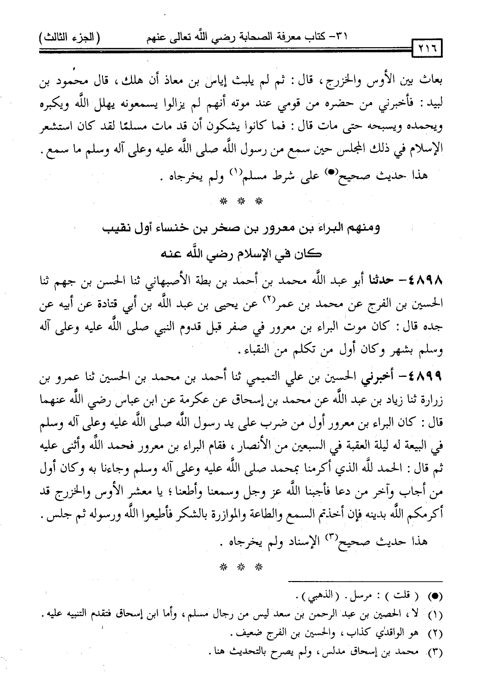 4898 - حَدَّثَنَا أَبُو عَبْدِ اللَّهِ مُحَمَّدُ بْنُ أَحْمَدَ بْنِ بُطَّةَ الْأَصْبَهَانِيُّ ، ثنا الْحَسَنُ بْنُ جَهْمٍ ، ثنا الْحُسَيْنُ بْنُ الْفَرَجِ ، عَنْ مُحَمَّدِ بْنِ عُمَرَ ، عَنْ يَحْيَى بْنِ عَبْدِ اللَّهِ بْنِ أَبِي قَتَادَةَ ، عَنْ أَبِيهِ ، عَنْ جَدِّهِ قَالَ: " كَانَ مَوْتُ الْبَرَاءِ بْنِ مَعْرُورٍ فِي صَفَرٍ قَبْلَ قَدُومِ النَّبِيِّ صَلَّى اللَّهُ عَلَيْهِ وَسَلَّمَ بِشَهْرٍ ، وَكَانَ أَوَّلُ مَنْ تَكَلَّمَ مِنَ النُّقَبَاءِ "
