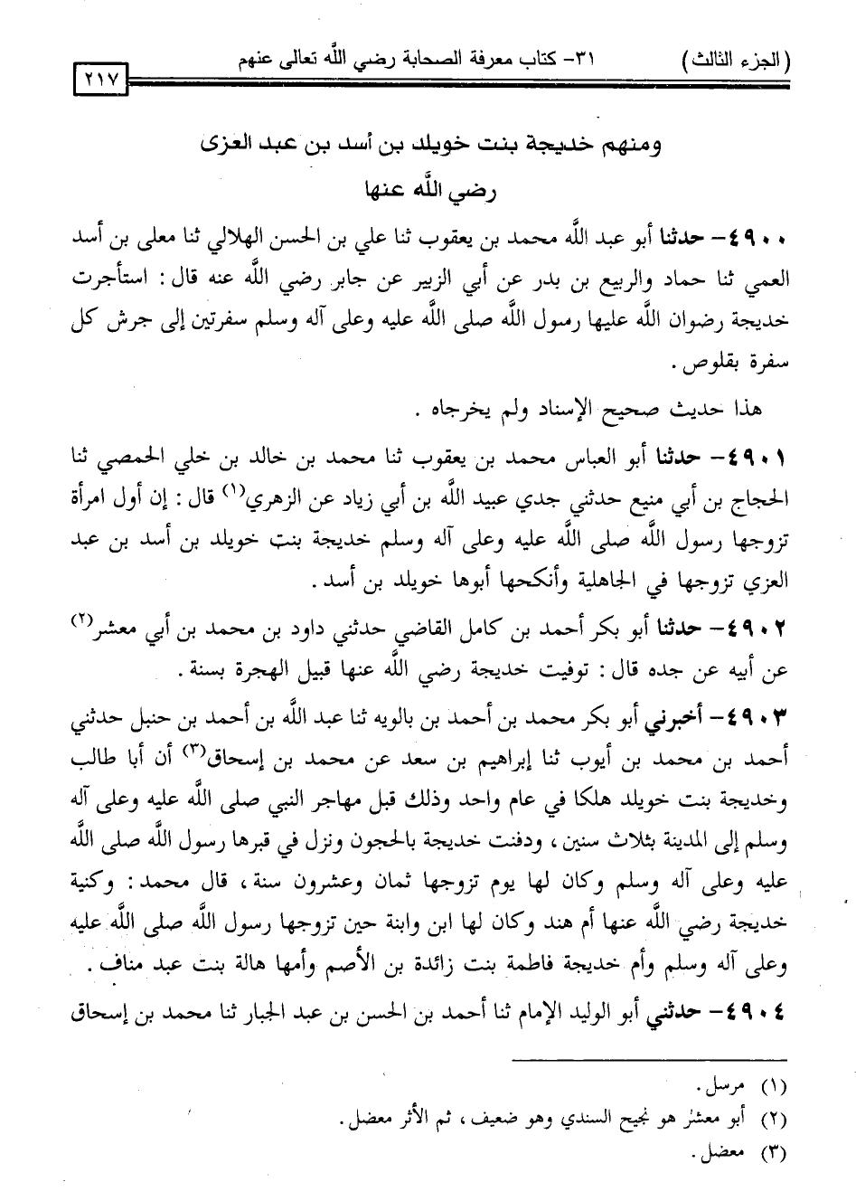 4903 - أَخْبَرَنِي أَبُو بَكْرٍ مُحَمَّدُ بْنُ أَحْمَدَ بْنِ بَالَوَيْهِ ، ثنا عَبْدُ اللَّهِ بْنُ أَحْمَدَ بْنِ حَنْبَلٍ ، حَدَّثَنِي أَحْمَدُ بْنُ مُحَمَّدِ بْنِ أَيُّوبَ ، ثنا إِبْرَاهِيمُ بْنُ سَعْدٍ ، عَنْ مُحَمَّدِ بْنِ إِسْحَاقَ ، " أَنَّ أَبَا طَالِبٍ وَخَدِيجَةَ بِنْتَ خُوَيْلِدٍ هَلَكَا فِي عَامٍ وَاحِدٍ ، وَذَلِكَ قَبْلَ مُهَاجِرٍ النَّبِيِّ صَلَّى اللَّهُ عَلَيْهِ وَسَلَّمَ إِلَى الْمَدِينَةِ بِثَلَاثِ سِنِينَ ، وَدُفِنَتْ خَدِيجَةُ بِالْحَجُونِ ، وَنَزَلَ فِي قَبْرِهَا رَسُولُ اللَّهِ صَلَّى اللَّهُ عَلَيْهِ وَسَلَّمَ ، وَكَانَ لَهَا يَوْمَ تَزَوَّجَهَا ثَمَانٌ وَعِشْرُونَ سَنَةً " ، قَالَ مُحَمَّدٌ: " وَكُنْيَةُ خَدِيجَةَ رَضِيَ اللَّهُ عَنْهَا أُمُّ هِنْدٍ ، وَكَانَ لَهَا ابْنٌ وَابْنَةٌ حِينَ تَزَوَّجَهَا رَسُولُ اللَّهِ صَلَّى اللَّهُ عَلَيْهِ وَسَلَّمَ ، وَأُمُّ خَدِيجَةَ فَاطِمَةُ بِنْتُ زَائِدَةَ بْنِ الْأَصَمِّ وَأُمُّهَا هَالَةُ بِنْتُ عَبْدِ مَنَافٍ "