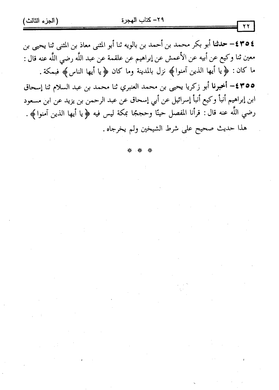 4355 - أَخْبَرَنَا أَبُو زَكَرِيَّا يَحْيَى بْنُ مُحَمَّدٍ الْعَنْبَرِيُّ ، ثنا مُحَمَّدُ بْنُ عَبْدِ السَّلَامِ ، ثنا إِسْحَاقُ بْنُ إِبْرَاهِيمَ ، أَنْبَأَ وَكِيعٌ ، أَنْبَأَ إِسْرَائِيلُ ، عَنْ أَبِي إِسْحَاقَ ، عَنْ عَبْدِ الرَّحْمَنِ بْنِ يَزِيدَ ، عَنِ ابْنِ مَسْعُودٍ رَضِيَ اللَّهُ عَنْهُ قَالَ: " قَرَأْنَا الْمُفَصَّلَ حِينًا ، وَحَجَجْنَا بِمَكَّةَ لَيْسَ فِيهَا يَا أَيُّهَا الَّذِينَ آمَنُوا "