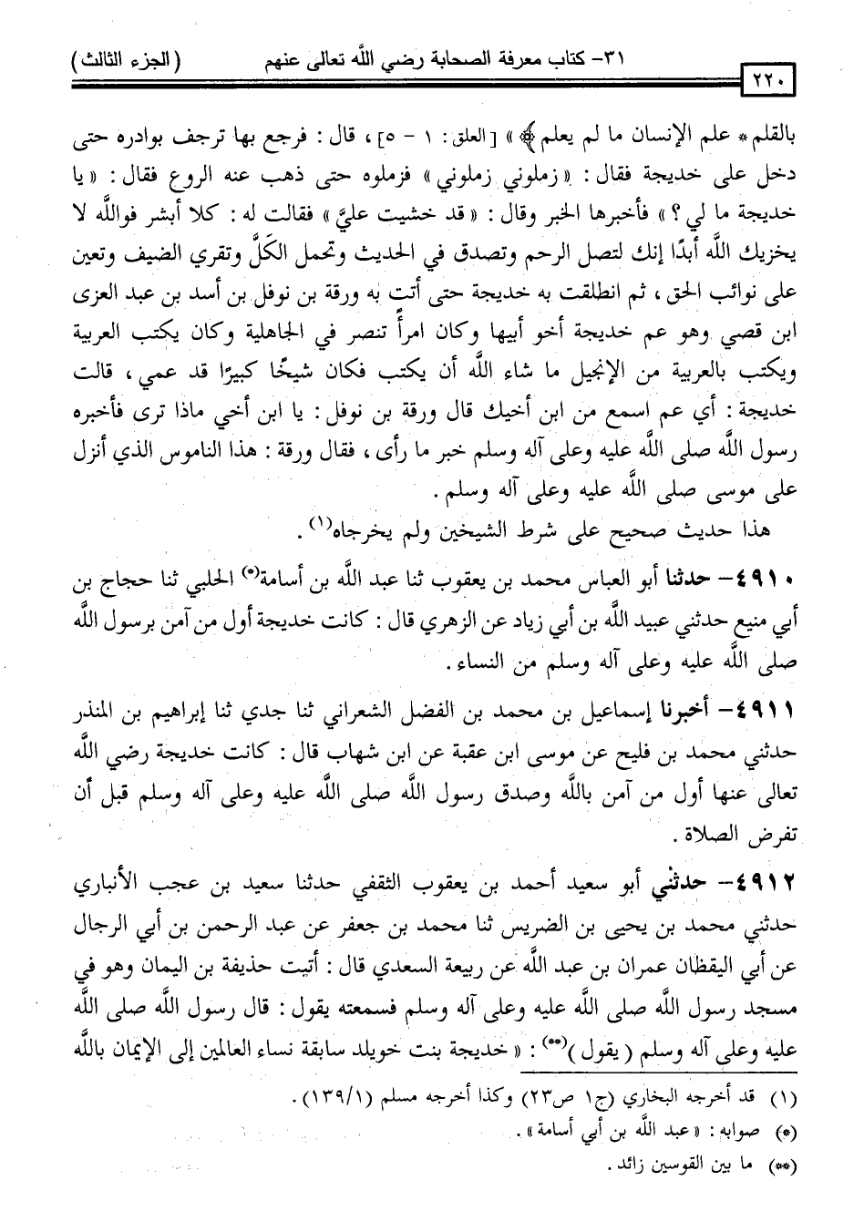 4910 - حَدَّثَنَا أَبُو الْعَبَّاسِ مُحَمَّدُ بْنُ يَعْقُوبَ ، ثنا عَبْدُ اللَّهِ بْنُ أَبِي أُسَامَةَ الْحَلَبِيُّ ، ثنا حَجَّاجُ بْنُ أَبِي مَنِيعٍ ، حَدَّثَنِي عُبَيْدُ اللَّهِ بْنُ أَبِي زِيَادٍ ، عَنِ الزُّهْرِيِّ قَالَ: " كَانَتْ خَدِيجَةُ أَوَّلَ مَنْ آمَنَ بِرَسُولِ اللَّهِ صَلَّى اللَّهُ عَلَيْهِ وَسَلَّمَ مِنَ النِّسَاءِ "