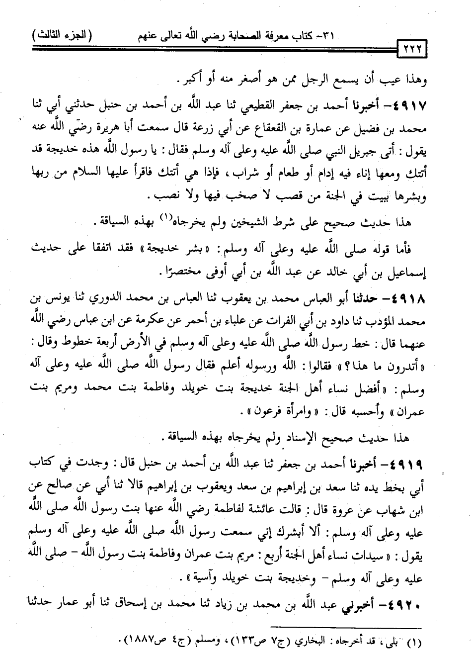 فَأَمَّا قَوْلُهُ صَلَّى اللَّهُ عَلَيْهِ وَسَلَّمَ: بَشِّرْ خَدِيجَةَ فَقَدِ اتَّفَقَا عَلَى حَدِيثِ إِسْمَاعِيلَ بْنِ أَبِي خَالِدٍ ، عَنْ عَبْدِ اللَّهِ بْنِ أَبِي أَوْفَى مُخْتَصَرًا "