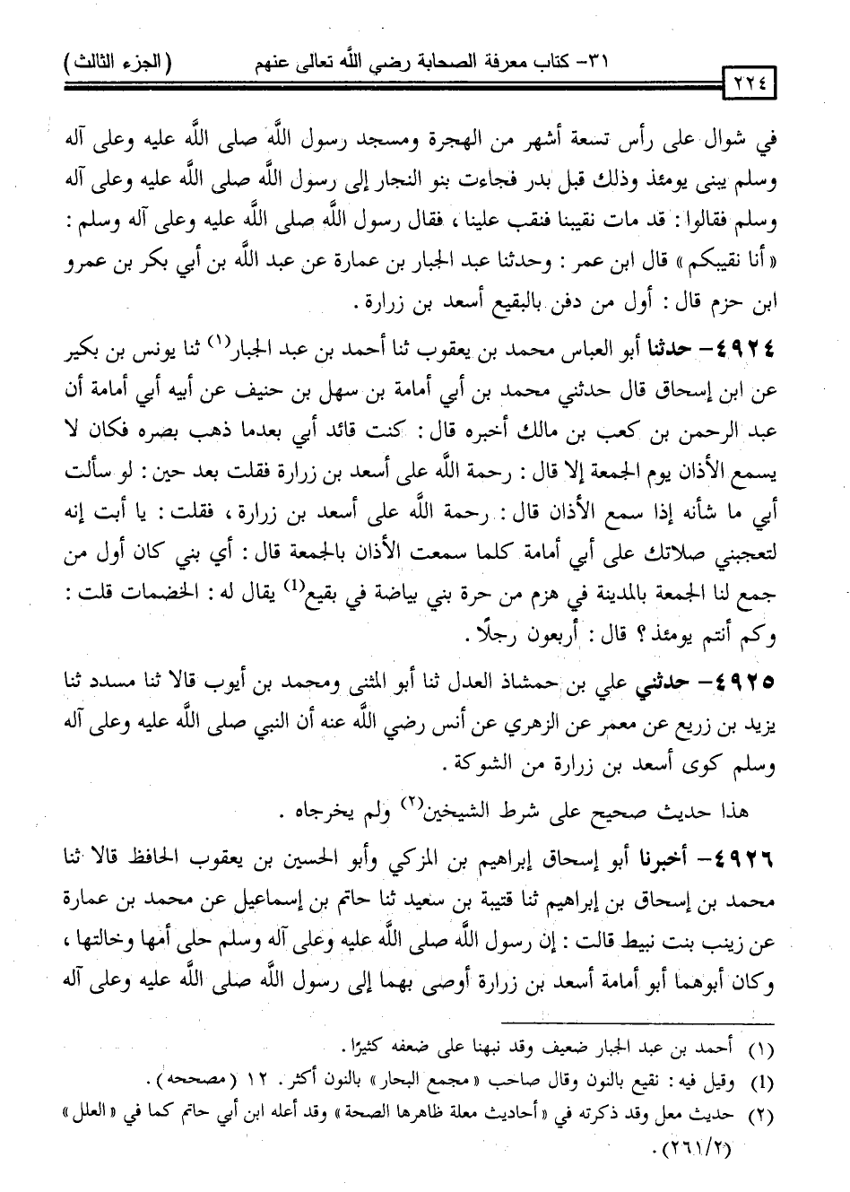 4924 - حَدَّثَنَا أَبُو الْعَبَّاسِ مُحَمَّدُ بْنُ يَعْقُوبَ ، ثنا أَحْمَدُ بْنُ عَبْدِ الْجَبَّارِ ، ثنا يُونُسُ بْنُ بُكَيْرٍ ، عَنِ ابْنِ إِسْحَاقَ ، قَالَ: حَدَّثَنِي مُحَمَّدُ بْنُ أَبِي أُمَامَةَ بْنِ سَهْلِ بْنِ حُنَيْفٍ ، عَنْ أَبِيهِ أَبِي أُمَامَةَ ، أَنَّ عَبْدَ الرَّحْمَنِ بْنَ كَعْبِ بْنِ مَالِكٍ أَخْبَرَهُ ، قَالَ: كُنْتُ قَائِدَ أَبِي بَعْدَمَا ذَهَبَ بَصَرُهُ فَكَانَ لَا يَسْمَعُ الْأَذَانَ يَوْمَ الْجُمُعَةِ إِلَّا قَالَ: رَحْمَةُ اللَّهِ عَلَى أَسْعَدَ بْنِ زُرَارَةَ ، فَقُلْتُ بَعْدَ حِينٍ: لَوْ سَأَلْتُ أَبِي مَا شَأْنُهُ إِذَا سَمِعَ الْأَذَانَ قَالَ: رَحْمَةُ اللَّهِ عَلَى أَسْعَدَ بْنِ زُرَارَةَ ؟ فَقُلْتُ: يَا أَبَتِ ، إِنَّهُ لَتُعْجِبُنِي صَلَاتُكَ عَلَى أَبِي أُمَامَةَ كُلَّمَا سَمِعْتَ الْأَذَانَ بِالْجُمُعَةِ ، قَالَ: " أَيْ بُنَيَّ ، كَانَ أَوَّلُ مَنْ جَمَعَ لَنَا الْجُمُعَةَ بِالْمَدِينَةِ فِي هَزْمٍ مِنْ حَرَّةِ بَنِي بَيَاضَةَ فِي بَقِيعِ يُقَالُ لَهُ الْخَضِمَاتِ " قُلْتُ: وَكَمْ أَنْتُمْ يَوْمَئِذٍ ؟ قَالَ: " أَرْبَعُونَ رَجُلًا "