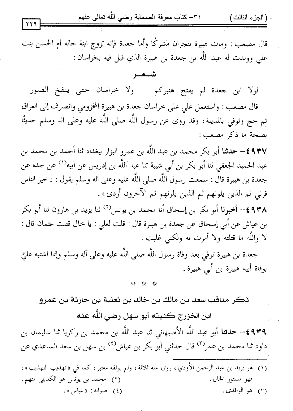 ذِكْرُ مَنَاقِبِ سَعْدِ بْنِ مَالِكِ بْنِ خَالِدِ بْنِ ثَعْلَبَةَ بْنِ حَارِثَةَ بْنِ عَمْرِو بْنِ الْخَزْرَجِ ، كُنْيَتُهُ أَبُو سَهْلٍ رَضِيَ اللَّهُ عَنْهُ