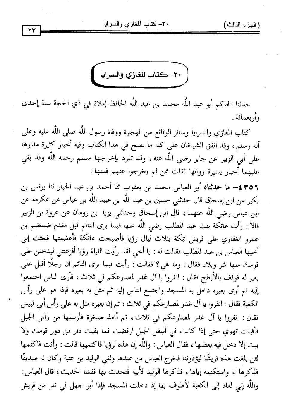 كِتَابُ الْمَغَازِي وَالسَّرَايَا وَسَائِرِ الْوَقَائعِ مِنَ الْهِجْرَةِ وَوَفَاةِ رَسُولِ اللَّهِ صَلَّى اللَّهُ عَلَيْهِ وَسَلَّمَ ، وَقَدِ اتَّفَقَ الشَّيْخَانِ عَلَى كُنْهِ مَا يَصِحُّ فِي هَذَا الْكِتَابِ ، وَفِيهِ أَخْبَارٌ كَثِيرَةٌ مَدَارُهَا عَلَى أَبِي الزُّبَيْرِ ، عَنْ جَابِرٍ رَضِيَ اللَّهُ عَنْهُ ، وَقَدْ تَفَرَّدَ بِإِخْرَاجِهَا مُسْلِمٌ رَحْمَةُ اللَّهِ ، وَقَدْ بَقِيَ عَلَيْهِمَا أَخْبَارٌ يَسِيرَةٌ ، رُوَاتُهَا ثِقَاتٌ مِمَّنْ لَمْ يُخَرِّجُوا عَنْهُمْ فَمِنْهَا "