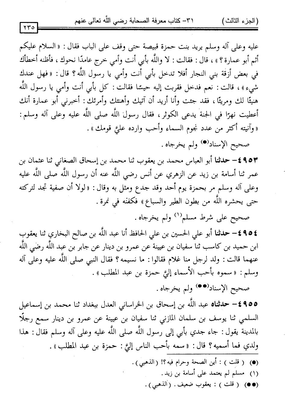 4953 - حَدَّثَنَا أَبُو الْعَبَّاسِ مُحَمَّدُ بْنُ يَعْقُوبَ ، ثنا مُحَمَّدُ بْنُ إِسْحَاقَ الصَّغَانِيُّ ، ثنا عُثْمَانُ بْنُ عُمَرَ ، ثنا أُسَامَةُ بْنُ زَيْدٍ ، عَنِ الزُّهْرِيِّ ، عَنْ أَنَسٍ رَضِيَ اللَّهُ عَنْهُ ، أَنَّ رَسُولَ اللَّهِ صَلَّى اللَّهُ عَلَيْهِ وَسَلَّمَ مَرَّ بِحَمْزَةَ يَوْمَ أُحُدٍ وَقَدْ جُدِعَ وَمُثِّلَ بِهِ وَقَالَ: " لَوْلَا أَنَّ صَفِيَّةَ تَجِدُ لَتَرَكْتُهُ حَتَّى يَحْشُرَهُ اللَّهُ مِنْ بُطُونِ الطَّيْرِ وَالسِّبَاعِ " فَكَفَّنَهُ فِي نَمِرَةٍ " صَحِيحٌ عَلَى شَرْطِ مُسْلِمٍ ، وَلَمْ يُخَرِّجَاهُ "