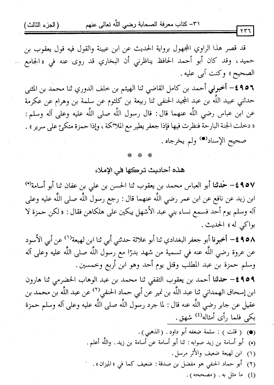 4958 - أَخْبَرَنَا أَبُو جَعْفَرٍ الْبَغْدَادِيُّ ، ثنا أَبُو عُلَاثَةَ ، حَدَّثَنِي أَبِي ، ثنا ابْنُ لَهِيعَةَ ، عَنْ أَبِي الْأَسْوَدِ ، عَنْ عُرْوَةَ رَضِيَ اللَّهُ عَنْهُ ، " فِي تَسْمِيَةِ مَنْ شَهِدَ بَدْرًا مَعَ رَسُولِ اللَّهِ صَلَّى اللَّهُ عَلَيْهِ وَسَلَّمَ حَمْزَةُ بْنُ عَبْدِ الْمُطَّلِبِ وَقُتِلَ يَوْمَ أُحُدٍ وَهُوَ ابْنُ أَرْبَعٍ وَخَمْسِينَ "