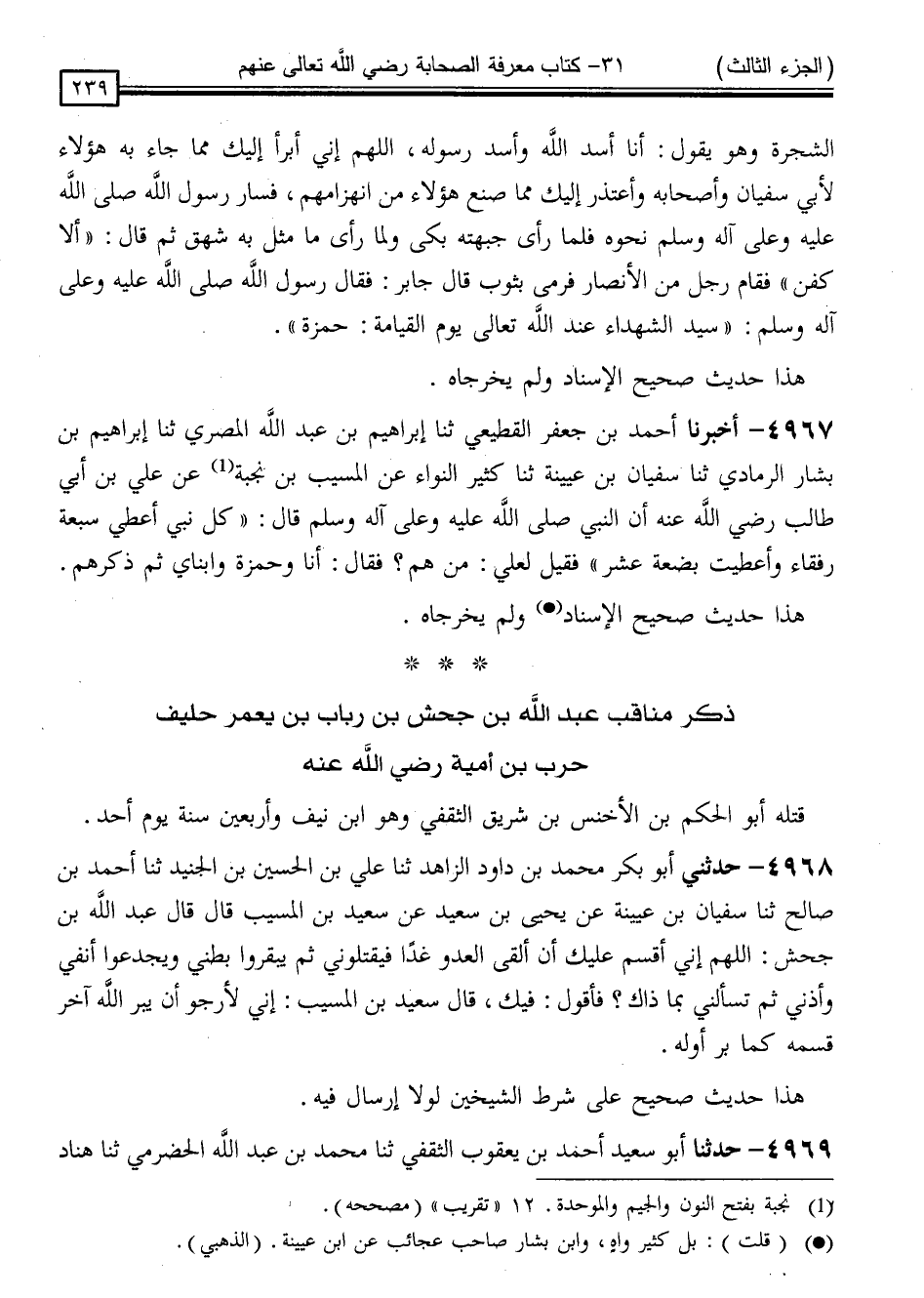 4968 - حَدَّثَنِي أَبُو بَكْرٍ مُحَمَّدُ بْنُ دَاوُدَ الزَّاهِدُ ، ثنا عَلِيُّ بْنُ الْحُسَيْنِ بْنِ الْجُنَيْدِ ، ثنا أَحْمَدُ بْنُ صَالِحٍ ، ثنا سُفْيَانُ بْنُ عُيَيْنَةَ ، عَنْ يَحْيَى بْنِ سَعِيدٍ ، عَنْ سَعِيدِ بْنِ الْمُسَيِّبِ قَالَ: قَالَ عَبْدُ اللَّهِ بْنُ جَحْشٍ: " اللَّهُمَّ إِنِّي أُقْسِمُ عَلَيْكَ أَنْ أَلْقَى الْعَدُوَّ غَدًا فَيَقْتُلُونِي ، ثُمَّ يَبْقُرُوا بَطْنِي ، وَيَجْدَعُوا أَنْفِي وَأُذُنِي ، ثُمَّ تَسْأَلُنِي بِمَا ذَاكَ ؟ فَأَقُولُ: فِيكَ " ، قَالَ سَعِيدُ بْنُ الْمُسَيِّبِ: " إِنِّي لَأَرْجُو أَنْ يَبَرَّ اللَّهُ آخِرَ قَسَمِهِ كَمَا بَرَّ أَوَّلَهُ "