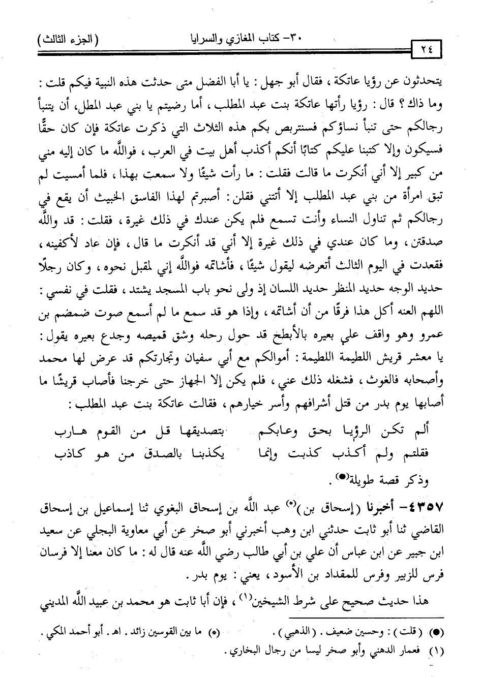 4357 - أَخْبَرَنَا (إِسْحَاقُ بْنُ) عَبْدُ اللَّهِ بْنُ إِسْحَاقَ الْبَغَوِيُّ ، ثنا إِسْمَاعِيلُ بْنُ إِسْحَاقَ الْقَاضِي ، ثنا أَبُو ثَابِتٍ ، حَدَّثَنِي ابْنُ وَهْبٍ ، أَخْبَرَنِي أَبُو صَخْرٍ ، عَنْ أَبِي مُعَاوِيَةَ الْبَجَلِيِّ ، عَنْ سَعِيدِ بْنِ جُبَيْرٍ ، عَنِ ابْنِ عَبَّاسٍ ، أَنَّ عَلِيَّ بْنَ أَبِي طَالِبٍ رَضِيَ اللَّهُ عَنْهُ ، قَالَ لَهُ: " مَا كَانَ مَعَنَا إِلَّا فَرَسَانِ فَرَسٌ لِلزُّبَيْرِ ، وَفَرَسٌ لِلْمِقْدَادِ بْنِ الْأَسْوَدِ - يَعْنِي يَوْمَ بَدْرٍ - "