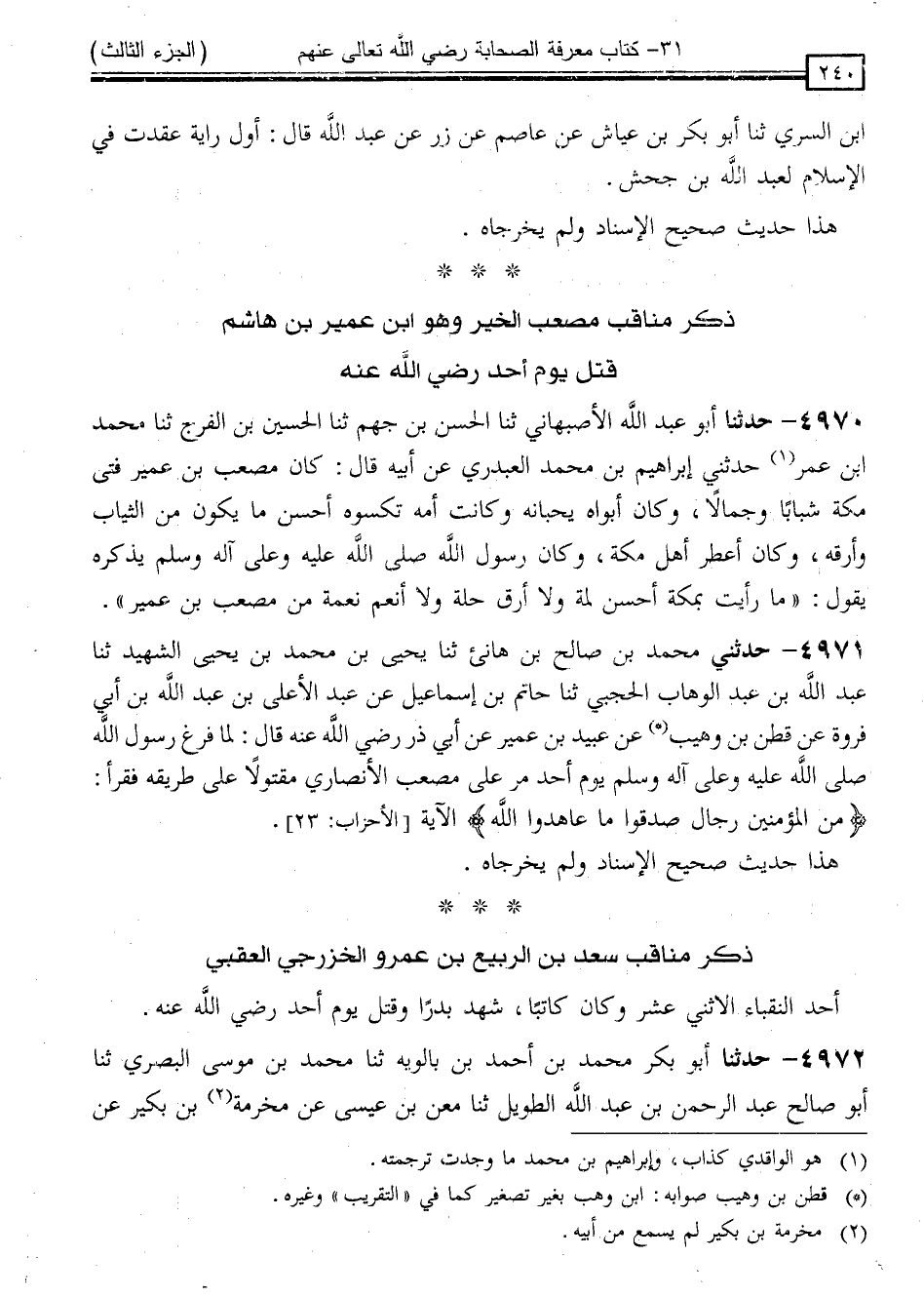 4971 - حَدَّثَنِي مُحَمَّدُ بْنُ صَالِحِ بْنِ هَانِئٍ ، ثنا يَحْيَى بْنُ مُحَمَّدِ بْنِ يَحْيَى الشَّهِيدُ ، ثنا عَبْدُ اللَّهِ بْنُ عَبْدِ الْوَهَّابِ الْحَجَبِيُّ ، ثنا حَاتِمُ بْنُ إِسْمَاعِيلَ ، عَنْ عَبْدِ الْأَعْلَى بْنِ عَبْدِ اللَّهِ بْنِ أَبِي فَرْوَةَ ، عَنْ قَطَنِ بْنِ وُهَيْبٍ ، عَنْ عُبَيْدِ بْنِ عُمَيْرٍ ، عَنْ أَبِي ذَرٍّ رَضِيَ اللَّهُ عَنْهُ ، قَالَ: " لَمَّا فَرَغَ رَسُولُ اللَّهِ صَلَّى اللَّهُ عَلَيْهِ وَسَلَّمَ يَوْمَ أُحُدٍ مَرَّ عَلَى مُصْعَبٍ الْأَنْصَارِيِّ مَقْتُولًا عَلَى طَرِيقِهِ ، فَقَرَأَ { مِنَ الْمُؤْمِنِينَ رِجَالٌ صَدَقُوا مَا عَاهَدُوا اللَّهَ عَلَيْهِ } [الأحزاب: 23] "