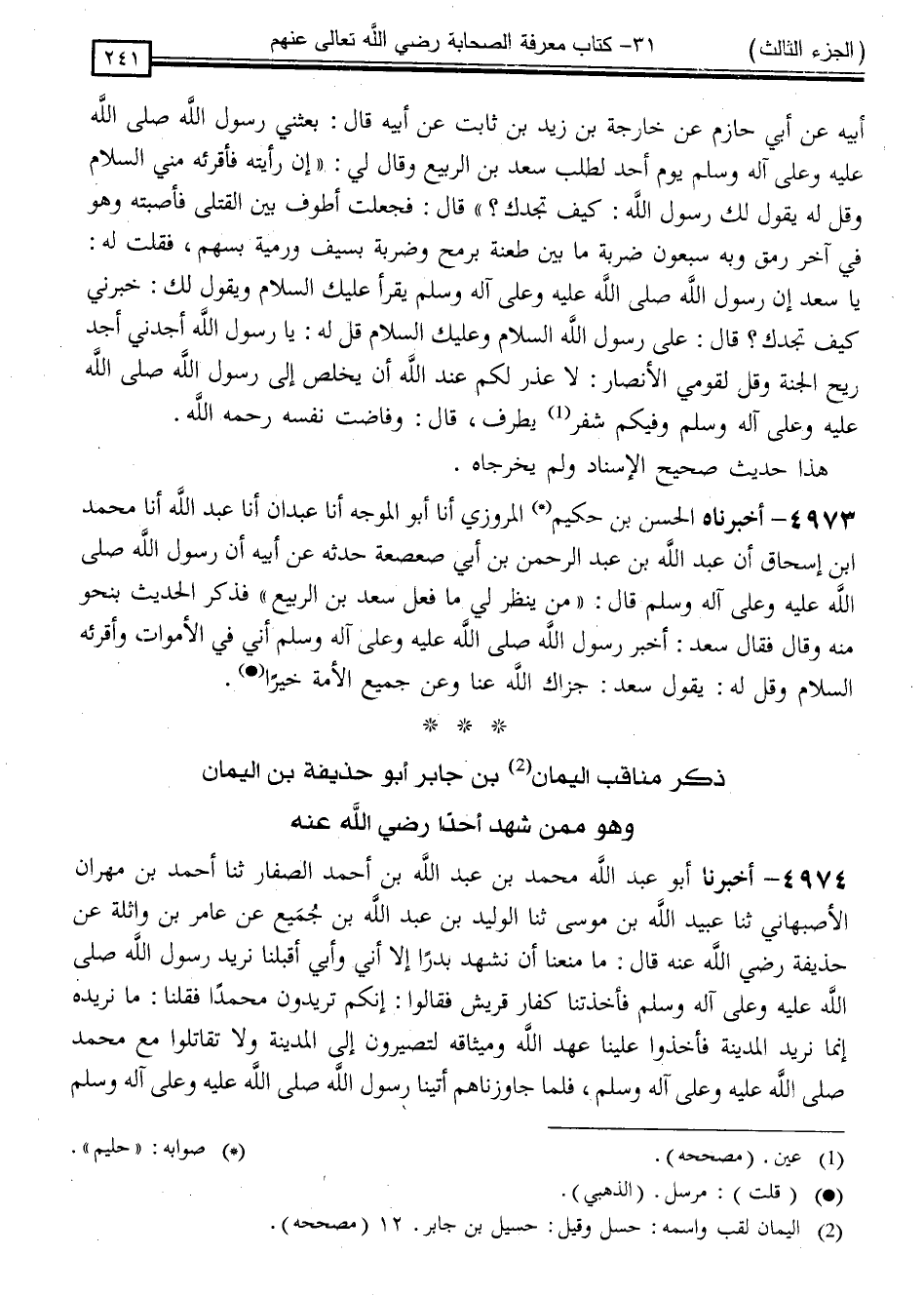 4973 - أَخْبَرْنَاهُ الْحَسَنُ بْنُ حَلِيمٍ الْمَرْوَزِيُّ ، أَنَا أَبُو الْمُوَجِّهِ ، أَنَا عَبْدَانُ ، أَنَا عَبْدُ اللَّهِ ، أَنَا مُحَمَّدُ بْنُ إِسْحَاقَ ، أَنَّ عَبْدَ اللَّهِ بْنَ عَبْدِ الرَّحْمَنِ بْنِ أَبِي صَعْصَعَةَ حَدَّثَهُ ، عَنْ أبيه ، أَنَّ رَسُولَ اللَّهِ صَلَّى اللَّهُ عَلَيْهِ وَسَلَّمَ ، قَالَ: " مَنْ يَنْظُرُ لِي مَا فَعَلَ سَعْدُ بْنُ الرَّبِيعِ ؟ " فَذَكَرَ الْحَدِيثَ بِنَحْوٍ مِنْهُ ، وَقَالَ: فَقَالَ سَعْدٌ: أَخْبِرْ رَسُولَ اللَّهِ صَلَّى اللَّهُ عَلَيْهِ وَسَلَّمَ أَنِّي فِي الْأَمْوَاتِ وَأَقْرِئْهُ السَّلَامَ ، وَقُلْ لَهُ: يَقُولُ سَعْدٌ: جَزَاكَ اللَّهُ عَنَّا وَعَنْ جَمِيعِ الْأُمَّةِ خَيْرًا
