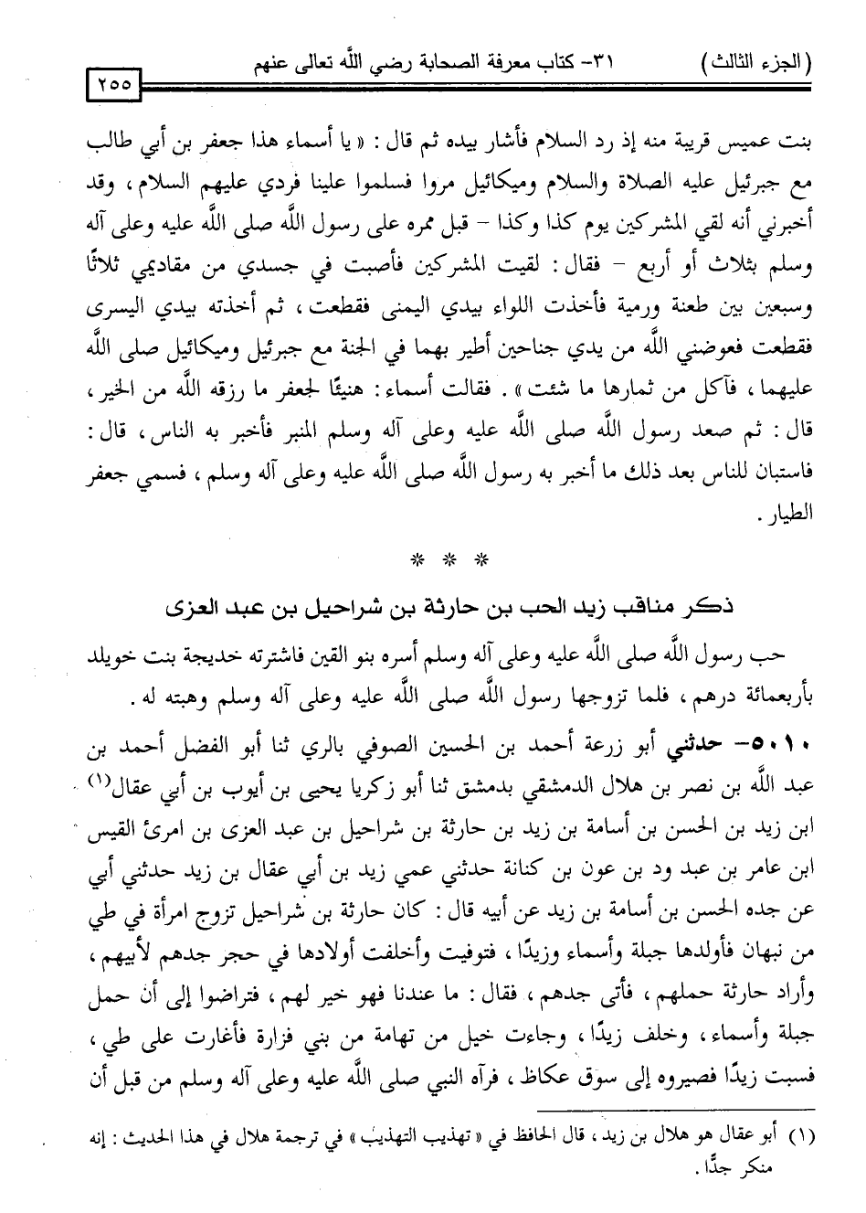 5011 - حَدَّثَنِي أَبُو زُرْعَةَ أَحْمَدُ بْنُ الْحُسَيْنِ الصُّوفِيُّ بِالرِّيِّ ، ثنا أَبُو الْفَضْلُ أَحْمَدُ بْنُ عَبْدِ اللَّهِ بْنِ نَصْرِ بْنِ هِلَالٍ الدِّمَشْقِيُّ بِدِمَشْقَ ، ثنا أَبُو زَكَرِيَّا يَحْيَى بْنُ أَيُّوبَ بْنِ أَبِي عِقَالِ بْنِ زَيْدِ بْنِ الْحَسَنِ بْنِ أُسَامَةَ بْنِ زَيْدِ بْنِ حَارِثَةَ بْنِ شَرَاحِيلَ بْنِ عَبْدِ الْعُزَّى بْنِ امْرِئِ الْقَيْسِ بْنِ عَامِرِ بْنِ عَبْدِ وَدِّ بْنِ عَوْنِ بْنِ كِنَانَةَ ، حَدَّثَنِي عَمِّي زَيْدُ بْنُ أَبِي عِقَالِ بْنِ زَيْدٍ ، حَدَّثَنِي أَبِي ، عَنْ جَدِّهِ الْحَسَنِ بْنِ أُسَامَةَ بْنِ زَيْدٍ ، عَنْ أَبِيهِ ، قَالَ: كَانَ حَارِثَةُ بْنُ شَرَاحِيلَ تَزَوَّجَ امْرَأَةً فِي طَيِّئٍ مِنْ نَبْهَانَ فَأَوْلَدَهَا جَبَلَةَ وَأَسْمَاءَ وَزَيْدًا ، فَتُوُفِّيَتْ وَأَخْلَفَتْ أَوْلَادَهَا فِي حِجْرِ جَدِّهِمْ لِأَبِيهِمْ ، وَأَرَادَ حَارِثَةُ حَمْلَهُمْ ، فَأَتَى جَدُّهُمْ فَقَالَ: مَا عِنْدَنَا فَهُوَ خَيْرٌ لَهُمْ ، فَتَرَاضَوْا إِلَى أَنْ حَمَلَ جَبَلَةَ وَأَسْمَاءَ وَخَلَّفِ زَيْدًا ، وَجَاءَتْ خَيْلٌ مِنْ تِهَامَةَ مِنْ بَنِي فَزَارَةَ فَأَغَارَتْ عَلَى طَيِّئٍ ، فَسَبَتْ زَيْدًا فَصَيَّرُوهُ إِلَى سُوقِ عُكَاظٍ ، فَرَآهُ النَّبِيُّ صَلَّى اللَّهُ عَلَيْهِ وَسَلَّمَ مِنْ قَبْلِ أَنِ -[256]- يُبْعَثَ ، فَقَالَ لِخَدِيجَةَ رَضِيَ اللَّهُ عَنْهَا: " يَا خَدِيجَةُ ، رَأَيْتُ فِي السُّوقِ غُلَامًا مِنْ صِفَتِهِ كَيْتَ وَكَيْتَ " ـ يَصِفُ عَقْلًا وَأَدَبًا وَجَمَالًا ـ لَوْ أَنَّ لِي مَالًا لَاشْتَرَيْتُهُ " فَأَمَرَتْ وَرَقَةَ بْنَ نَوْفَلٍ فَاشْتَرَاهُ مِنْ مَالِهَا ، فَقَالَ: " يَا خَدِيجَةُ ، هَبِي لِي هَذَا الْغُلَامَ بِطِيبٍ مِنْ نَفْسِكِ " فَقَالَتْ: يَا مُحَمَّدُ ، أَرَى غُلَامًا وَضِيئًا وَأَخَافُ أَنْ تَبِيعَهُ أَوْ تَهِبَهُ ، فَقَالَ النَّبِيُّ صَلَّى اللَّهُ عَلَيْهِ وَسَلَّمَ: " يَا مُوَفَّقَةُ ، مَا أَرَدْتُ إِلَّا لَأَتَبَنَّاهُ " فَقَالَتْ: نَعَمْ ، يَا مُحَمَّدُ فَرَبَّاهُ وَتَبَنَّاهُ ، فَكَانَ يُقَالُ لَهُ: زَيْدُ بْنُ مُحَمَّدٍ ، فَجَاءَ رَجُلٌ مِنَ الْحَيِّ فَنَظَرَ إِلَى زَيْدٍ فَعَرَفَهُ ، فَقَالَ: أَنْتَ زَيْدُ بْنُ حَارِثَةَ ، قَالَ: لَا ، أَنَا زَيْدُ بْنُ مُحَمَّدٍ ، قَالَ: لَا ، بَلْ أَنْتَ زَيْدُ بْنُ حَارِثَةَ مِنْ صِفَةِ أَبِيكَ وَعُمُوَمَتِكَ وَأَخْوَالِكَ كَيْتَ وَكَيْتَ ، قَدْ أَتْعَبُوا الْأَبْدَانَ وَأَنْفِقُوا الْأَمْوَالَ فِي سَبِيلِكَ ، فَقَالَ زَيْدٌ: