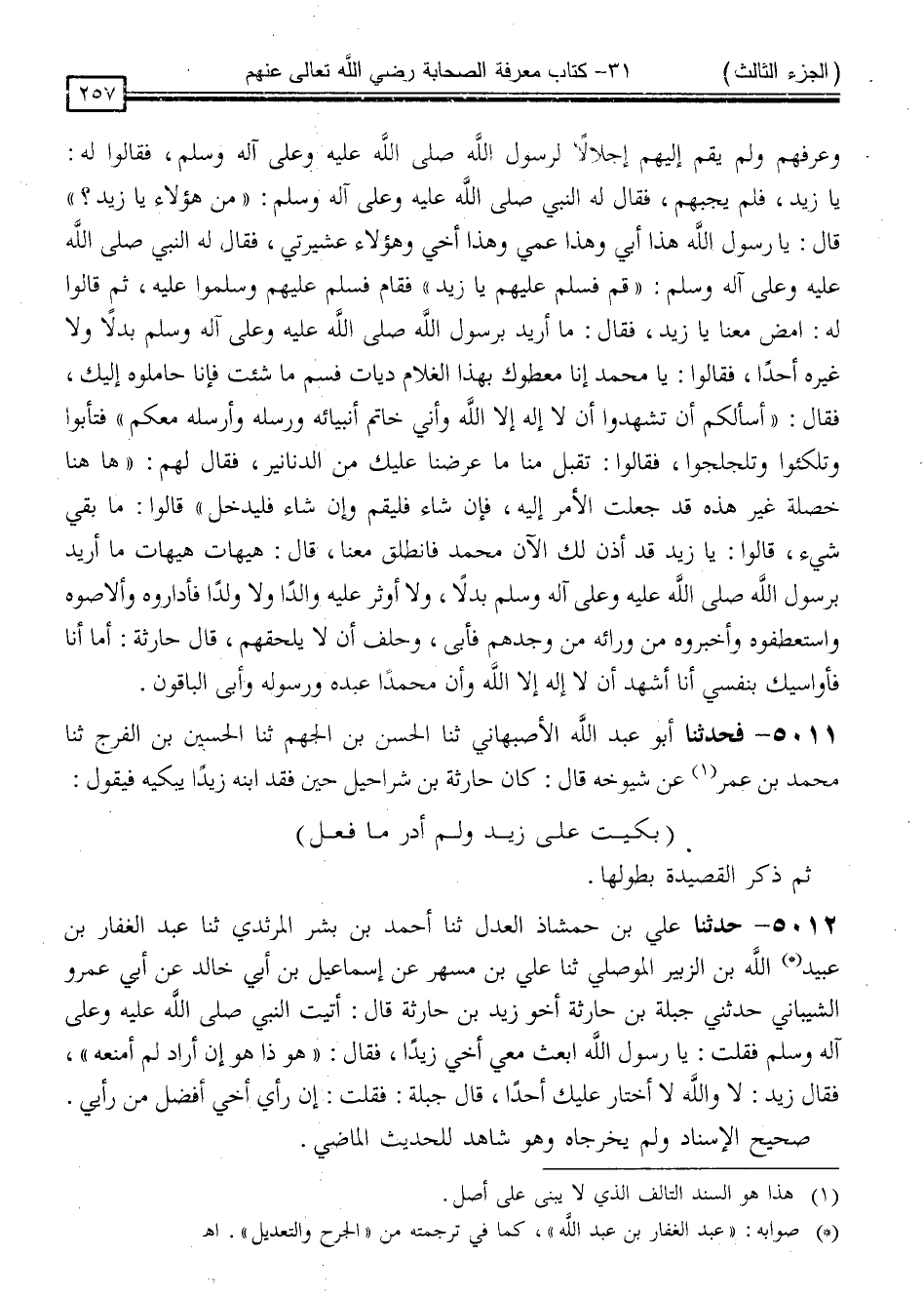 5012 - حَدَّثَنَا عَلِيُّ بْنُ حَمْشَاذَ الْعَدْلُ ، ثنا أَحْمَدُ بْنُ بِشْرٍ الْمَرْثَدِيُّ ، ثنا عَبْدُ الْغَفَّارِ بْنُ عُبَيْدِ اللَّهِ بْنِ الزُّبَيْرِ الْمَوْصِلِيُّ ، ثنا عَلِيُّ بْنُ مُسْهِرٍ ، عَنْ إِسْمَاعِيلَ بْنِ أَبِي خَالِدٍ ، عَنْ أَبِي عَمْرِو الشَّيْبَانِيِّ ، حَدَّثَنِي جَبَلَةُ بْنُ حَارِثَةَ أَخُو زَيْدِ بْنِ حَارِثَةَ ، قَالَ: أَتَيْتُ النَّبِيَّ صَلَّى اللَّهُ عَلَيْهِ وَسَلَّمَ فَقُلْتُ: يَا رَسُولَ اللَّهِ ، ابْعَثْ مَعِي أَخِي زَيْدًا ، فَقَالَ: " هُوَ ذَا هُوَ ، إِنْ أَرَادَ لَمْ أَمْنَعْهُ " فَقَالَ زَيْدٌ: لَا وَاللَّهِ لَا أَخْتَارُ عَلَيْكَ أَحَدًا ، قَالَ جَبَلَةُ: فَقُلْتُ: إِنَّ رَأْيَ أَخِي أَفْضَلُ مِنْ رَأْيِيِ " صَحِيحُ الْإِسْنَادِ وَلَمْ يُخَرِّجَاهُ ، وَهُوَ شَاهِدٌ لِلْحَدِيثِ الْمَاضِي "