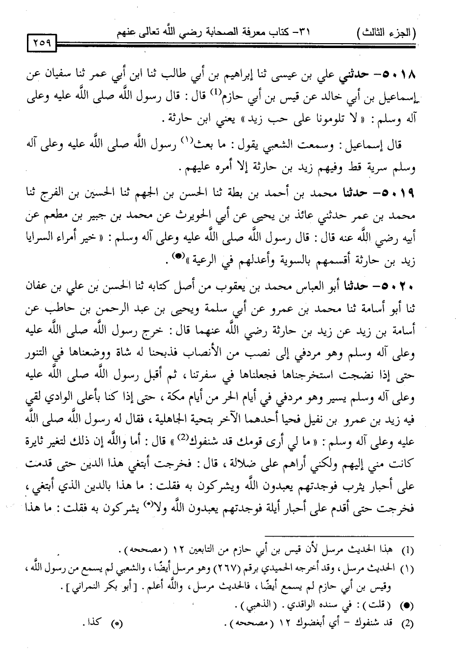 5020 - حَدَّثَنَا أَبُو الْعَبَّاسِ مُحَمَّدُ بْنُ يَعْقُوبَ مِنْ أَصْلِ كِتَابِهِ ، ثنا الْحَسَنُ بْنُ عَلِيِّ بْنِ عَفَّانَ ، ثنا أَبُو أُسَامَةَ ، ثنا مُحَمَّدُ بْنُ عَمْرِو ، عَنْ أَبِي سَلَمَةَ ، وَيَحْيَى بْنِ عَبْدِ الرَّحْمَنِ بْنِ حَاطِبٍ ، عَنْ أُسَامَةَ بْنِ زَيْدٍ ، عَنْ زَيْدِ بْنِ حَارِثَةَ رَضِيَ اللَّهُ عَنْهُمَا قَالَ: خَرَجَ رَسُولُ اللَّهِ صَلَّى اللَّهُ عَلَيْهِ وَسَلَّمَ وَهُوَ مُرْدِفِي إِلَى نُصُبٍ مِنَ الْأَنْصَابِ ، فَذَبَحْنَا لَهُ شَاةً وَوَضَعْنَاهَا فِي التَّنُّورِ ، حَتَّى إِذَا نَضِجَتِ اسْتَخْرَجْنَاهَا فَجَعَلْنَاهَا فِي سُفْرَتِنَا ، ثُمَّ أَقْبَلَ رَسُولُ اللَّهِ صَلَّى اللَّهُ عَلَيْهِ وَسَلَّمَ يَسِيرُ وَهُوَ مُرْدِفِي فِي أَيَّامِ الْحَرِّ مِنْ أَيَّامِ مَكَّةَ ، حَتَّى إِذَا كُنَّا بِأَعْلَى الْوَادِي لَقِيَ فِيهِ زَيْدَ بْنَ عَمْرِو بْنِ نُفَيْلٍ ، فَحَيَّا أَحَدُهُمَا الْآخَرَ بِتَحِيَّةِ الْجَاهِلِيَّةِ ، فَقَالَ لَهُ رَسُولُ اللَّهِ صَلَّى اللَّهُ عَلَيْهِ وَسَلَّمَ: " مَا لِي أَرَى قَوْمَكَ قَدْ شَنَفُوكَ ؟ " قَالَ: أَمَا وَاللَّهِ إِنَّ ذَلِكَ لِتَغَيُّرِ ثَائِرَةٍ كَانَتْ مِنِّي إِلَيْهِمْ ، وَلَكِنِّي أَرَاهُمْ عَلَى ضَلَالَةٍ ، قَالَ: فَخَرَجْتُ أَبْتَغِي هَذَا الدِّينَ حَتَّى قَدِمْتُ عَلَى أَحْبَارِ يَثْرِبَ فَوَجَدْتُهُمْ يَعْبُدُونَ اللَّهَ وَيُشْرِكُونَ بِهِ ، فَقُلْتُ: مَا هَذَا بِالدِّينِ الَّذِي أَبْتَغِي ، فَخَرَجْتُ حَتَّى أَقْدَمَ عَلَى أَحْبَارِ أَيْلَةَ فَوَجَدْتُهُمْ يَعْبُدُونَ اللَّهَ وَيُشْرِكُونَ بِهِ ، فَقُلْتُ: مَا هَذَا -[260]- بِالدِّينِ الَّذِي أَبْتَغِي ، فَقَالَ لِي حَبْرٌ مِنْ أَحْبَارِ الشَّامِ: إِنَّكَ تَسْأَلُ عَنْ دِينٍ مَا نَعْلَمُ أَحَدًا يَعْبُدُ اللَّهَ بِهِ إِلَّا شَيْخًا بِالْجَزِيرَةِ ، فَخَرَجْتُ حَتَّى قَدِمْتُ إِلَيْهِ ، فَأَخْبَرْتُهُ الَّذِي خَرَجْتُ لَهُ ، فَقَالَ: إِنَّ كُلَّ مَنْ رَأَيْتَهُ فِي ضَلَالَةٍ إِنَّكَ تَسْأَلُ عَنْ دِينٍ هُوَ دِينُ اللَّهِ ، وَدِينُ مَلَائِكَتِهِ ، وَقَدْ خَرَجَ فِي أَرْضِكَ نَبِيٌّ أَوْ هُوَ خَارِجٌ ، يَدْعُو إِلَيْهِ ، ارْجِعْ إِلَيْهِ وَصَدِّقْهُ وَاتَّبِعْهُ ، وَآمِنَ بِمَا جَاءَ بِهِ ، فَرَجَعْتُ فَلَمْ أُحْسِنْ شَيْئًا بَعْدُ ، فَأَنَاخَ رَسُولُ اللَّهِ صَلَّى اللَّهُ عَلَيْهِ وَسَلَّمَ الْبَعِيرَ الَّذِي كَانَ تَحْتَهُ ، ثُمَّ قَدَّمْنَا إِلَيْهِ السُّفْرَةَ الَّتِي كَانَ فِيهَا الشِّوَاءُ ، فَقَالَ: مَا هَذِهِ ؟ فَقُلْنَا: " هَذِهِ شَاةٌ ذَبَحْنَاهَا لِنُصُبِ كَذَا وَكَذَا " ، فَقَالَ: إِنِّي لَا آكُلَ مَا ذُبِحَ لِغَيْرِ اللَّهِ ، وَكَانَ صَنَمًا مِنْ نُحَاسٍ يُقَالُ لَهُ: إِسَافُ وَنَائِلَةُ يَتَمَسَّحُ بِهِ الْمُشْرِكُونَ إِذَا طَافُوا ، فَطَافَ رَسُولُ اللَّهِ صَلَّى اللَّهُ عَلَيْهِ وَسَلَّمَ وَطُفْتُ مَعَهُ ، فَلَمَّا مَرَرْتُ مَسَحْتُ بِهِ ، فَقَالَ رَسُولُ اللَّهِ صَلَّى اللَّهُ عَلَيْهِ وَسَلَّمَ: لَا تَمَسَّهُ ، قَالَ زَيْدٌ: فَطُفْنَا ، فَقُلْتُ فِي نَفْسِي: لَأَمَسَّنَّهُ حَتَّى أَنْظُرَ مَا يَقُولُ ، فَمَسَحْتُهُ ، فَقَالَ رَسُولُ اللَّهِ صَلَّى اللَّهُ عَلَيْهِ وَسَلَّمَ: " أَلَمْ تُنْهَ ؟ " قَالَ زَيْدٌ: فَوَالَّذِي أَكْرَمَهُ وَأَنْزَلَ عَلَيْهِ الْكِتَابَ مَا اسْتَلَمْتُ صَنَمًا حَتَّى أَكْرَمَهُ اللَّهُ بِالَّذِي أَكْرَمَهُ ، وَأَنْزَلَ عَلَيْهِ الْكِتَابَ ، وَمَاتَ زَيْدُ بْنُ عَمْرِو بْنِ نُفَيْلٍ قَبْلَ أَنْ يُبْعَثَ ، فَقَالَ رَسُولُ اللَّهِ صَلَّى اللَّهُ عَلَيْهِ وَسَلَّمَ: " يَأْتِي يَوْمَ الْقِيَامَةِ أُمَّةً وَحْدَهُ "