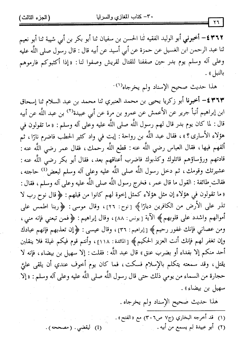4363 - أَخْبَرَنَا أَبُو زَكَرِيَّا يَحْيَى بْنُ مُحَمَّدٍ الْعَنْبَرِيُّ ، ثنا مُحَمَّدُ بْنُ عَبْدِ السَّلَامِ ، ثنا إِسْحَاقُ بْنُ إِبْرَاهِيمَ ، أَنْبَأَ جَرِيرٌ ، عَنِ الْأَعْمَشِ ، عَنْ عَمْرِو بْنِ مُرَّةَ ، عَنْ أَبِي عُبَيْدَةَ بْنِ عَبْدِ اللَّهِ ، عَنْ أَبِيهِ قَالَ: لَمَّا كَانَ يَوْمُ بَدْرٍ ، قَالَ لَهُمْ رَسُولُ اللَّهِ صَلَّى اللَّهُ عَلَيْهِ وَسَلَّمَ: " مَا تَقُولُونَ فِي هَؤُلَاءِ الْأُسَارَى " فَقَالَ عَبْدُ اللَّهِ بْنُ رَوَاحَةَ: ايْتِ فِي وَادٍ كَثِيرِ الْحَطَبِ فَأَضْرِمْ نَارًا ، ثُمَّ أَلْقِهِمْ فِيهَا ، فَقَالَ الْعَبَّاسُ رَضِيَ اللَّهُ عَنْهُ: قَطَعَ اللَّهُ رَحِمَكَ ، فَقَالَ عُمَرُ رَضِيَ اللَّهُ عَنْهُ: قَادَتُهُمْ وَرُءُسَاؤُهُمْ قَاتَلُوكَ وَكَذَّبُوكَ فَاضْرِبْ أَعْنَاقَهُمْ بَعْدُ ، فَقَالَ أَبُو بَكْرٍ رَضِيَ اللَّهُ عَنْهُ: عَشِيرَتُكَ وَقَوْمُكَ ، ثُمَّ دَخَلَ رَسُولُ اللَّهِ صَلَّى اللَّهُ عَلَيْهِ وَسَلَّمَ لِبَعْضِ حَاجَتِهِ ، فَقَالَتْ طَائِفَةٌ: الْقَوْلُ مَا قَالَ عُمَرُ ، فَخَرَجَ رَسُولُ اللَّهِ صَلَّى اللَّهُ عَلَيْهِ وَسَلَّمَ ، فَقَالَ: " مَا تَقُولُونَ فِي هَؤُلَاءِ ؟ إِنَّ مَثَلَ هَؤُلَاءِ كَمَثَلِ إِخْوَةٍ لَهُمْ كَانُوا مِنْ قَبْلِهِمْ ، { قَالَ نُوحٌ رَبِّ لَا تَذَرْ عَلَى الْأَرْضِ مِنَ الْكَافِرِينَ دَيَّارًا } [نوح: 26] وَقَالَ مُوسَى: { رَبَّنَا اطْمِسْ عَلَى أَمْوَالِهِمْ وَاشْدُدْ عَلَى قُلُوبِهِمْ } [يونس: 88] الْآيَةَ وَقَالَ إِبْرَاهِيمُ: { فَمَنْ تَبِعَنِي فَإِنَّهُ مِنِّي وَمَنْ عَصَانِي فَإِنَّكَ غَفُورٌ رَحِيمٌ } [إبراهيم: 36] وَقَالَ عِيسَى: { إِنْ تُعَذِّبْهُمْ فَإِنَّهُمْ عِبَادُكَ وَإِنْ تَغْفِرْ لَهُمْ فَإِنَّكَ أَنْتَ الْعَزِيزُ الْحَكِيمُ } [المائدة: 118] وَأَنْتُمْ قَوْمٌ فِيكُمْ غِيلَةٌ فَلَا يَنْقَلِبَنَّ أَحَدٌ مِنْكُمْ إِلَّا بِفِدَاءٍ أَوْ بِضَرْبِ عُنُقٍ " قَالَ عَبْدُ اللَّهِ: فَقُلْتُ: إِلَّا سُهَيْلَ بْنَ بَيْضَاءَ فَإِنَّهُ لَا يُقْتَلُ ، وَقَدْ سَمِعْتُهُ يَتَكَلَّمُ بِالْإِسْلَامِ فَسَكَتَ ، فَمَا كَانَ يَوْمٌ أَخْوَفُ عِنْدِي أَنْ يُلْقَى عَلَيَّ حِجَارَةٌ مِنَ السَّمَاءِ مِنْ يَوْمِي ذَلِكَ حَتَّى قَالَ رَسُولُ اللَّهِ صَلَّى اللَّهُ عَلَيْهِ وَسَلَّمَ: " إِلَّا سُهَيْلَ بْنَ بَيْضَاءَ "