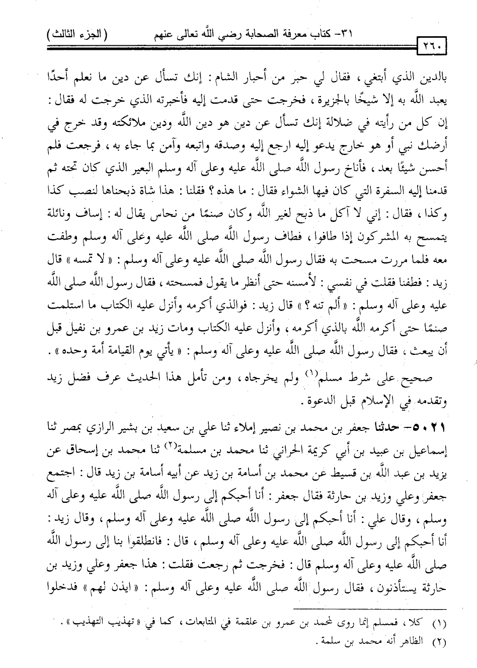 5021 - حَدَّثَنَا جَعْفَرُ بْنُ مُحَمَّدِ بْنِ نُصَيْرٍ إِمْلَاءً ، ثنا عَلِيُّ بْنُ سَعِيدِ بْنِ بَشِيرٍ الرَّازِيُّ بِمِصْرَ ، ثنا إِسْمَاعِيلُ بْنُ عُبَيْدِ بْنِ أَبِي كَرِيمَةَ الْحَرَّانِيُّ ، ثنا مُحَمَّدُ بْنُ مَسْلَمَةَ ، ثنا مُحَمَّدُ بْنُ إِسْحَاقَ ، عَنْ يَزِيدَ بْنِ عَبْدِ اللَّهِ بْنِ قُسَيْطٍ ، عَنْ مُحَمَّدِ بْنِ أُسَامَةَ بْنِ زَيْدٍ ، عَنْ أَبِيهِ أُسَامَةَ بْنِ زَيْدٍ قَالَ: اجْتَمَعَ جَعْفَرٌ وَعَلِيٌّ وَزَيْدُ بْنُ حَارِثَةَ ، فَقَالَ جَعْفَرٌ: أَنَا أَحَبُّكُمْ إِلَى رَسُولِ اللَّهِ صَلَّى اللَّهُ عَلَيْهِ وَسَلَّمَ ، وَقَالَ عَلِيٌّ: أَنَا أَحَبُّكُمْ إِلَى رَسُولِ اللَّهِ صَلَّى اللَّهُ عَلَيْهِ وَسَلَّمَ ، وَقَالَ زَيْدٌ: أَنَا أَحَبُّكُمْ إِلَى رَسُولِ اللَّهِ صَلَّى اللَّهُ عَلَيْهِ وَسَلَّمَ ، قَالَ: فَانْطَلِقُوا بِنَا إِلَى رَسُولِ اللَّهِ صَلَّى اللَّهُ عَلَيْهِ وَسَلَّمَ ، قَالَ: فَخَرَجْتُ ثُمَّ رَجَعْتُ ، فَقُلْتُ: هَذَا جَعْفَرٌ ، وَعَلِيٌّ ، وَزَيْدُ بْنُ حَارِثَةَ يَسْتَأْذِنُونَ ، فَقَالَ رَسُولُ اللَّهِ صَلَّى اللَّهُ عَلَيْهِ وَسَلَّمَ: " ائْذَنْ لَهُمْ " فَدَخَلُوا ، -[261]- فَقَالُوا: يَا رَسُولَ اللَّهِ ، جِئْنَاكَ نَسْأَلُكَ مَنْ أَحَبُّ النَّاسِ إِلَيْكَ ؟ قَالَ: " فَاطِمَةُ " قَالُوا: نَسْأَلُكَ عَنِ الرِّجَالِ ، قَالَ: " أَمَا أَنْتَ يَا جَعْفَرُ ، فَيُشْبِهُ خَلْقَكَ خَلْقِي ، وَيُشْبِهُ خُلُقَكَ خُلُقِي ، وَأَنْتَ إِلَيَّ وَمِنْ شَجَرَتِي ، وَأَمَّا أَنْتَ يَا عَلِيُّ فَأَخِي وَأَبُو وَلَدَيَّ ، وَمِنِّي وَإِلَيَّ ، وَأَمَّا أَنْتَ يَا زَيْدُ فَمَوْلَايَ وَمِنِّي وَإِلَيَّ وَأَحَبُّ الْقَوْمِ إِلَيَّ "