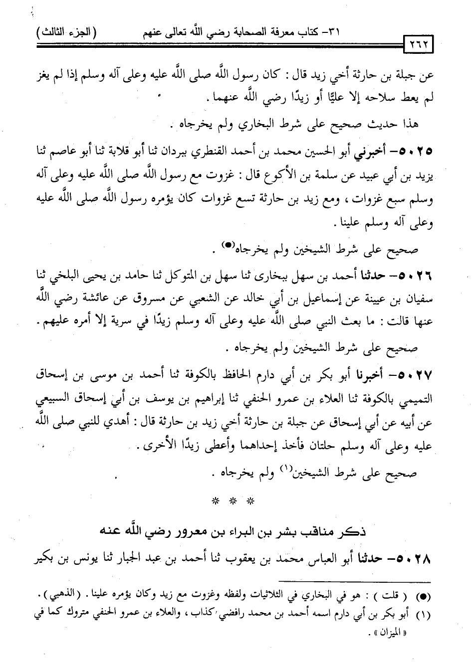 5027 - أَخْبَرَنَا أَبُو بَكْرِ بْنُ أَبِي دَارِمٍ الْحَافِظُ بِالْكُوفَةِ ، ثنا أَحْمَدُ بْنُ مُوسَى بْنِ إِسْحَاقَ التَّمِيمِيُّ بِالْكُوفَةِ ، ثنا الْعَلَاءُ بْنُ عَمْرٍو الْحَنَفِيُّ ، ثنا إِبْرَاهِيمُ بْنُ يُوسُفَ بْنِ أَبِي إِسْحَاقَ السَّبِيعِيُّ ، عَنْ أَبِيهِ ، عَنْ أَبِي إِسْحَاقَ ، عَنْ جَبَلَةَ بْنِ حَارِثَةَ أَخِي زَيْدِ بْنِ حَارِثَةَ ، قَالَ: " أُهْدِيَ لِلنَّبِيِّ صَلَّى اللَّهُ عَلَيْهِ وَسَلَّمَ حُلَّتَانِ فَأَخَذَ إِحْدَاهُمَا ، وَأَعْطَى زَيْدًا الْأُخْرَى "