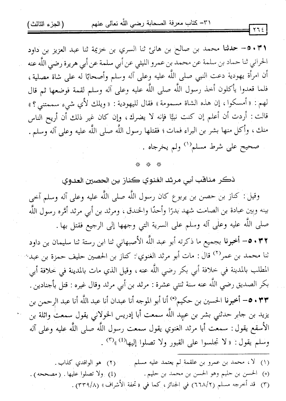 5033 - أَخْبَرَنَا الْحُسَيْنُ * بْنُ حَلِيمٍ ، أَنَا أَبُو الْمُوَجِّهِ ، أَنَا عَبْدَانُ ، أَنَا عَبْدِ اللَّهِ ، أَنَا عَبْدِ الرَّحْمَنِ بْنُ يَزِيدَ بْنِ جَابِرٍ ، حَدَّثَنِي بِشْرُ ** بْنُ عُبَيْدِ اللَّهِ ، سَمِعْتُ أَبَا إِدْرِيسَ الْخَوْلَانِيَّ ، يَقُولُ: سَمِعْتُ وَاثِلَةَ بْنَ الْأَسْقَعِ ، يَقُولُ: سَمِعْتُ أَبَا مَرْثَدٍ الْغَنَوِيَّ يَقُولُ: سَمِعْتُ رَسُولَ اللَّهِ صَلَّى اللَّهُ عَلَيْهِ وَسَلَّمَ يَقُولُ: " لَا تَجْلِسُوا عَلَى الْقُبُورِ وَلَا تُصَلُّوا إِلَيْهَا "