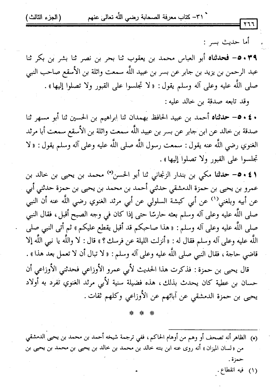 5041 - حَدَّثَنَا مَكِّيُّ بْنُ بُنْدَارٍ الزَّنْجَانِيُّ [بِبَغْدَادَ] ، ثنا أَبُو الْحَسَنِ * مُحَمَّدُ بْنُ يَحْيَى بْنِ خَالِدِ بْنِ عَمْرِو بْنِ يَحْيَى بْنِ حَمْزَةَ الدِّمَشْقِيُّ ، حَدَّثَنِي أَحْمَدُ بْنُ مُحَمَّدِ بْنِ يَحْيَى بْنِ حَمْزَةَ ، حَدَّثَنِي أَبِي ، عَنْ أَبِيهِ ، وَبَلَغَنِي عَنْ أَبِي كَبْشَةَ السَّلُولِيِّ ، عَنْ أَبِي مَرْثَدٍ الْغَنَوِيِّ رَضِيَ اللَّهُ عَنْهُ ، أَنَّ النَّبِيَّ صَلَّى اللَّهُ عَلَيْهِ وَسَلَّمَ بَعَثَهُ حَارِسًا ، حَتَّى إِذَا كَانَ وَجْهُ الصُّبْحِ أَقْبَلَ فَقَالَ النَّبِيُّ صَلَّى اللَّهُ عَلَيْهِ وَسَلَّمَ: " هَذَا صَاحِبُكُمْ قَدْ أَقْبَلَ يَقْطَعُ عَلَيْكُمْ " ثُمَّ أَتَى النَّبِيَّ صَلَّى اللَّهُ عَلَيْهِ وَسَلَّمَ ، فَقَالَ لَهُ: " أَنَزَلْتَ اللَّيْلَةَ عَنْ فَرَسِكَ ؟ " قَالَ: لَا وَاللَّهِ يَا نَبِيَّ اللَّهِ إِلَّا قَاضِيَ حَاجَةٍ ، فَقَالَ النَّبِيُّ صَلَّى اللَّهُ عَلَيْهِ وَسَلَّمَ: " لَا تُبَالِ أَنْ لَا تَعْمَلَ بَعْدَ هَذَا "