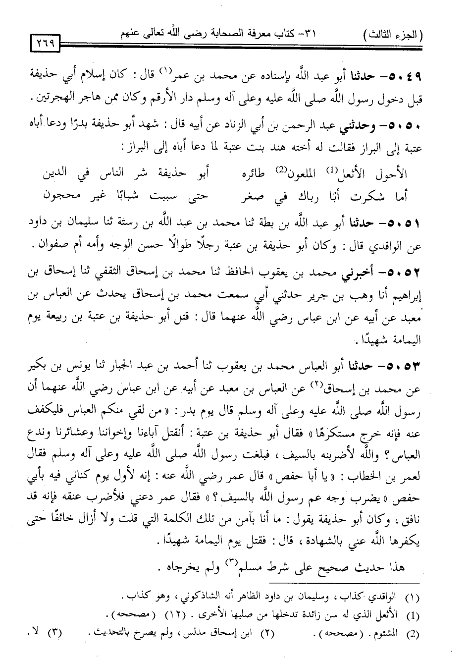 5049 - حَدَّثَنَا أَبُو عَبْدِ اللَّهِ ، بِإِسْنَادِهِ ، عَنْ مُحَمَّدِ بْنِ عُمَرَ ، قَالَ: " كَانَ إِسْلَامُ أَبِي حُذَيْفَةَ قَبْلَ دُخُولِ رَسُولِ اللَّهِ صَلَّى اللَّهُ عَلَيْهِ وَسَلَّمَ دَارَ الْأَرْقَمِ وَكَانَ مِمَّنْ هَاجَرَ الْهِجْرَتَيْنِ "