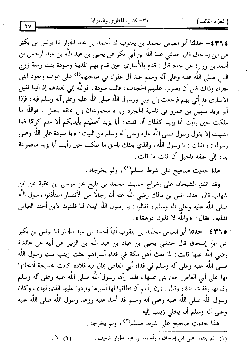 4365 - حَدَّثَنَا أَبُو الْعَبَّاسِ مُحَمَّدُ بْنُ يَعْقُوبَ ، أَنْبَأَ أَحْمَدُ بْنُ عَبْدِ الْجَبَّارِ ، ثنا يُونُسُ بْنُ بُكَيْرٍ ، عَنِ ابْنِ إِسْحَاقَ ، قَالَ: حَدَّثَنِي يَحْيَى بْنُ عَبَّادِ بْنِ عَبْدِ اللَّهِ بْنِ الزُّبَيْرِ ، عَنْ أَبِيهِ ، عَنْ عَائِشَةَ رَضِيَ اللَّهُ عَنْهَا قَالَتْ: لَمَّا بَعَثَ أَهْلُ مَكَّةَ فِي فِدَاءِ أَسَارَاهُمْ ، بَعَثَتْ زَيْنَبُ بِنْتُ رَسُولِ اللَّهِ صَلَّى اللَّهُ عَلَيْهِ وَسَلَّمَ فِي فِدَاءِ أَبِي الْعَاصِ بِمَالٍ فِيهِ قِلَادَةٌ كَانَتْ خَدِيجَةُ أَدْخَلَتْهَا بِهَا عَلَى أَبِي الْعَاصِ حِينَ بَنَى عَلَيْهَا ، فَلَمَّا رَآهَا رَسُولُ اللَّهِ صَلَّى اللَّهُ عَلَيْهِ وَسَلَّمَ رَقَّ لَهَا رِقَّةً شَدِيدَةً وَقَالَ: " إِنْ رَأَيْتُمْ أَنْ تُطْلِقُوا لَهَا أَسِيرَهَا وَتَرُدُّوا عَلَيْهَا الَّذِي لَهَا " وَكَانَ رَسُولُ اللَّهِ صَلَّى اللَّهُ عَلَيْهِ وَسَلَّمَ قَدْ أَخَذَ عَلَيْهِ ، وَوَعَدَ رَسُولَ اللَّهِ صَلَّى اللَّهُ عَلَيْهِ وَسَلَّمَ أَنْ يُخَلِّيَ زَيْنَبَ إِلَيْهِ