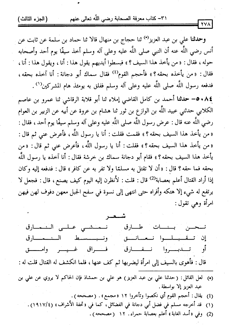 5084 - حَدَّثَنَا أَحْمَدُ بْنُ كَامِلٍ الْقَاضِي إِمْلَاءً ، ثنا أَبُو قِلَابَةَ الرَّقَاشِيُّ ، ثنا عَمْرُو بْنُ عَاصِمُ الْكِلَابِيُّ ، حَدَّثَنِي عُبَيْدُ اللَّهِ بْنُ الْوَازِعِ بْنُ ثَوْرٍ ، ثنا هِشَامُ بْنُ عُرْوَةَ ، عَنْ أَبِيهِ ، عَنِ الزُّبَيْرِ بْنِ الْعَوَّامِ رَضِيَ اللَّهُ عَنْهُ ، قَالَ: عَرَضَ رَسُولُ اللَّهِ صَلَّى اللَّهُ عَلَيْهِ وَسَلَّمَ سَيْفًا يَوْمَ أُحُدٍ ، فَقَالَ: " مَنْ يَأْخُذُ هَذَا السَّيْفَ بِحَقِّهِ ؟ " فَقُمْتُ فَقُلْتُ: أَنَا يَا رَسُولَ اللَّهِ ، فَأَعْرَضَ عَنِّي ثُمَّ قَالَ: " مَنْ يَأْخُذُ هَذَا السَّيْفَ بِحَقِّهِ ؟ " فَقُلْتُ: أَنَا يَا رَسُولَ اللَّهِ ، فَأَعْرَضَ عَنِّي ثُمَّ قَالَ: " مَنْ يَأْخُذُ هَذَا السَّيْفَ بِحَقِّهِ ؟ " فَقَامَ أَبُو دُجَانَةَ سِمَاكُ بْنُ خَرَشَةَ ، فَقَالَ: أَنَا آخُذُهُ يَا رَسُولَ اللَّهِ بِحَقِّهِ ، فَمَا حَقَّهُ ؟ قَالَ: " أَنْ لَا تَقْتُلَ بِهِ مُسْلِمًا وَلَا تَفِرَّ بِهِ عَنْ كَافِرٍ " ، قَالَ: فَدَفَعَهُ إِلَيْهِ وَكَانَ إِذَا أَرَادَ الْقِتَالَ أَعْلَمَ بِعِصَابَةٍ ، قَالَ: قُلْتُ: لَأَنْظُرَنَّ إِلَيْهِ الْيَوْمَ كَيْفَ يَصْنَعُ ؟ قَالَ: فَجَعَلَ لَا يَرْتَفِعُ لَهُ شَيْءٌ إِلَّا هَتَكَهُ وَأَفْرَاهُ حَتَّى انْتَهَى إِلَى نِسْوَةٍ فِي سَفْحِ الْجَبَلِ مَعَهُنَّ دُفُوفٌ لَهُنَّ فِيهِنَّ امْرَأَةٌ وَهِيَ تَقُولُ:
