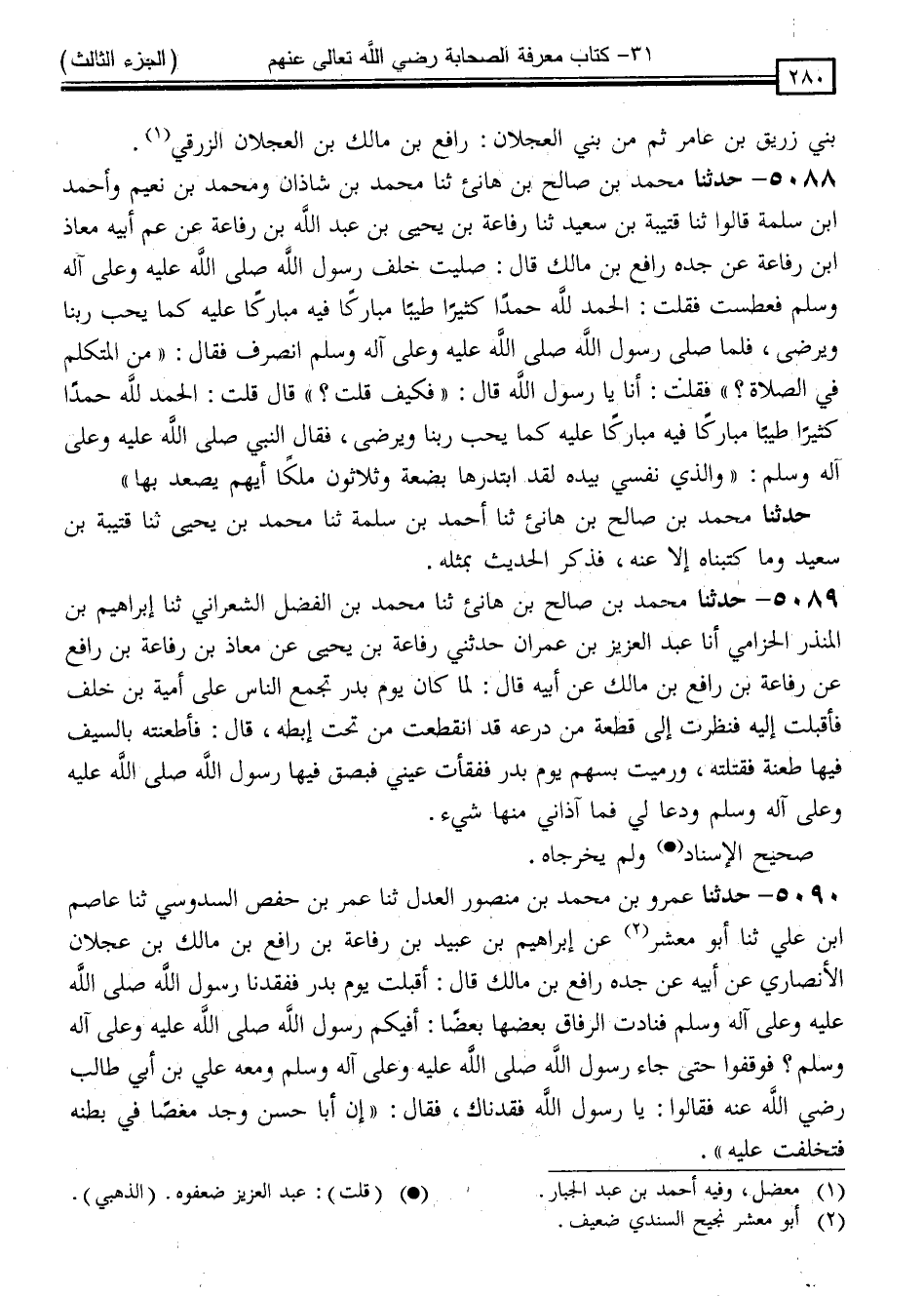 5090 - حَدَّثَنَا عَمْرُو بْنُ مُحَمَّدِ بْنِ مَنْصُورٍ الْعَدْلُ ، ثنا عُمَرُ بْنُ حَفْصٍ السَّدُوسِيُّ ، ثنا عَاصِمُ بْنُ عَلِيٍّ ، ثنا أَبُو مَعْشَرٍ ، عَنْ إِبْرَاهِيمَ بْنِ عُبَيْدِ بْنِ رِفَاعَةَ بْنِ رَافِعِ بْنِ مَالِكِ بْنِ عَجْلَانَ الْأَنْصَارِيِّ ، عَنْ أَبِيهِ ، عَنْ جَدِّهِ رَافِعِ بْنِ مَالِكٍ قَالَ: أَقْبَلْتُ يَوْمَ بَدْرٍ فَفَقَدْنَا رَسُولَ اللَّهِ صَلَّى اللَّهُ عَلَيْهِ وَسَلَّمَ فَنَادَتِ الرِّفَاقُ بَعْضُهَا بَعْضًا: أَفِيكُمْ رَسُولُ اللَّهِ صَلَّى اللَّهُ عَلَيْهِ وَسَلَّمَ ؟ فَوَقَفُوا حَتَّى جَاءَ رَسُولُ اللَّهِ صَلَّى اللَّهُ عَلَيْهِ وَسَلَّمَ وَمَعَهُ عَلِيُّ بْنُ أَبِي طَالِبٍ رَضِيَ اللَّهُ عَنْهُ ، فَقَالُوا: يَا رَسُولَ اللَّهِ ، فَقَدْنَاكَ ، فَقَالَ: " إِنَّ أَبَا حَسَنٍ وَجَدَ مَغَصًا فِي بَطْنِهِ فَتَخَلَّفْتُ عَلَيْهِ "