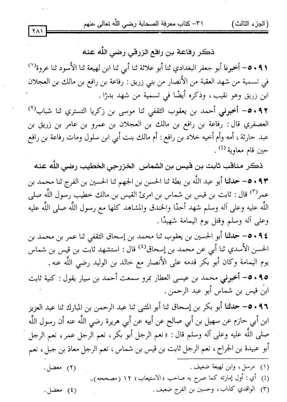 5092 - أَخْبَرَنِي أَحْمَدُ بْنُ يَعْقُوبَ الثَّقَفِيُّ ، ثنا مُوسَى بْنُ زَكَرِيَّا التُّسْتَرِيُّ ، ثنا شَبَابٌ الْعُصْفُرِيُّ قَالَ: " رِفَاعَةُ بْنُ رَافِعِ بْنِ مَالِكِ بْنِ الْعَجْلَانِ بْنِ عَمْرِو بْنِ عَامِرِ بْنِ زُرَيْقِ بْنِ عَبْدِ حَارِثَةَ أُمُّهُ ، وَأُمُّ أَخِيهِ خَلَّادِ بْنِ رَافِعٍ ، أُمُّ مَالِكِ بِنْتِ أُبَيَّ ابْنِ سَلُولٍ ، وَمَاتَ رِفَاعَةُ بْنُ رَافِعٍ حِينَ قَامَ مُعَاوِيَةُ "