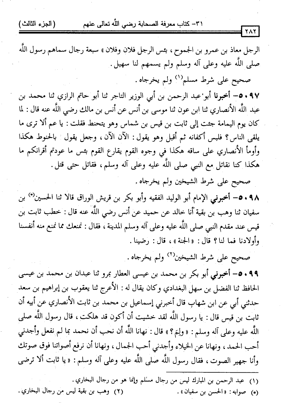 " صَحِيحٌ عَلَى شَرْطِ الشَّيْخَيْنِ ، وَلَمْ يُخَرِّجَاهُ بِهَذِهِ السِّيَاقَةِ " إِنَّمَا أَخْرَجَ مُسْلِمٌ وَحْدَهُ حَدِيثَ حَمَّادِ بْنِ سَلَمَةَ وَسُلَيْمَانَ بْنِ الْمُغِيرَةِ ، عَنْ ثَابِتٍ ، عَنْ أَنَسٍ رَضِيَ اللَّهُ عَنْهُ ، قَالَ: لَمَّا أُنْزِلَتْ { لَا تَرْفَعُوا أَصْوَاتَكُمْ فَوْقَ صَوْتِ النَّبِيِّ } [الحجرات: 2] جَاءَ ثَابِتُ بْنُ قَيْسٍ وَذَكَرَ الْحَدِيثَ مُخْتَصَرًا