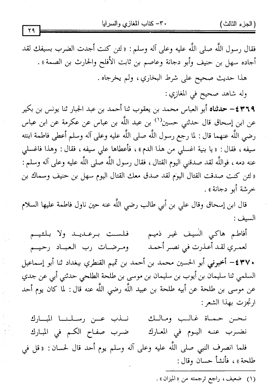 4369 - حَدَّثَنَاهُ أَبُو الْعَبَّاسِ مُحَمَّدُ بْنُ يَعْقُوبَ ، ثنا أَحْمَدُ بْنُ عَبْدِ الْجَبَّارِ ، ثنا يُونُسُ بْنُ بُكَيْرٍ ، عَنِ ابْنِ إِسْحَاقَ ، قَالَ: حَدَّثَنِي حُسَيْنُ بْنُ عَبْدِ اللَّهِ بْنِ عُبَيْدِ اللَّهِ بْنِ عَبَّاسٍ ، عَنْ عِكْرِمَةَ ، عَنِ ابْنِ عَبَّاسٍ رَضِيَ اللَّهُ عَنْهُمَا قَالَ: لَمَّا رَجَعَ رَسُولُ اللَّهِ صَلَّى اللَّهُ عَلَيْهِ وَسَلَّمَ أَعْطَى فَاطِمَةَ ابْنَتَهُ سَيْفَهُ ، فَقَالَ: " يَا بُنَيَّةُ اغْسِلِي عَنْ هَذَا الدَّمِ " فَأَعْطَاهَا عَلِيٌّ سَيْفَهُ ، فَقَالَ: وَهَذَا فَاغْسِلِي عَنْهُ دَمَهُ ، فَوَاللَّهِ لَقَدْ صَدَقَنِي الْيَوْمَ الْقِتَالَ ، فَقَالَ رَسُولُ اللَّهِ صَلَّى اللَّهُ عَلَيْهِ وَسَلَّمَ: " لَئِنْ كُنْتَ صَدَقْتَ الْقِتَالَ الْيَوْمَ لَقَدْ صَدَقَ مَعَكَ الْقِتَالُ الْيَوْمَ سَهْلُ بْنُ حُنَيْفٍ وَسِمَاكُ بْنُ خَرَشَةَ أَبُو دُجَانَةَ " قَالَ ابْنُ إِسْحَاقَ: وَقَالَ عَلِيُّ بْنُ أَبِي طَالِبٍ رَضِيَ اللَّهُ عَنْهُ حِينَ نَاوَلَ فَاطِمَةَ عَلَيْهَا السَّلَامُ السَّيْفَ "