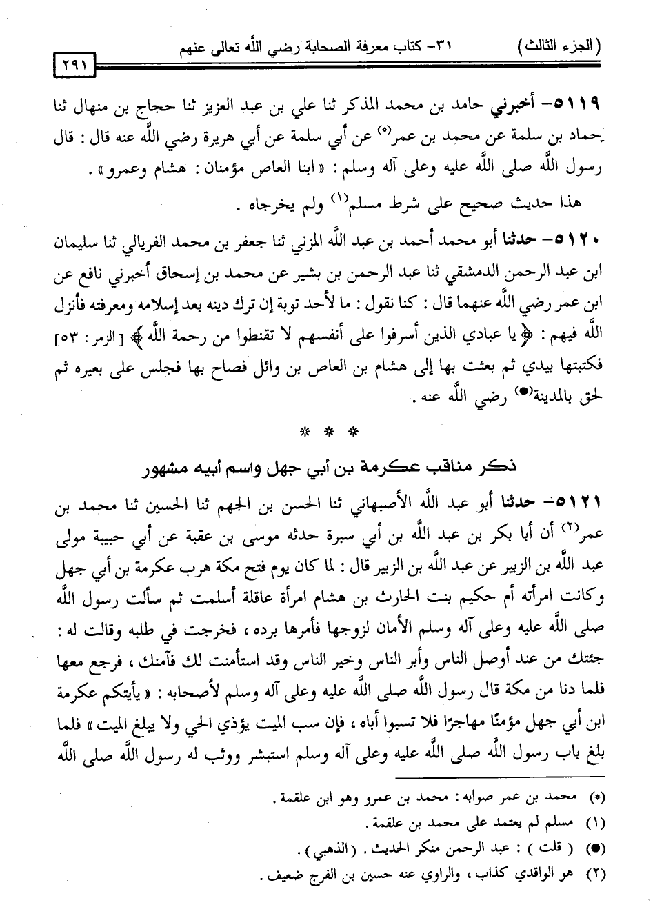 5119 - أَخْبَرَنِي حَامِدُ بْنُ مُحَمَّدٍ الْمُذَكِّرُ * ، ثنا عَلِيُّ بْنُ عَبْدِ الْعَزِيزِ ، ثنا حَجَّاجُ بْنُ مِنْهَالٍ ، ثنا حَمَّادُ بْنُ سَلَمَةَ ، عَنْ مُحَمَّدِ بْنِ عُمَرَ ** ، عَنْ أَبِي سَلَمَةَ ، عَنْ أَبِي هُرَيْرَةَ رَضِيَ اللَّهُ عَنْهُ قَالَ: قَالَ رَسُولُ اللَّهِ صَلَّى اللَّهُ عَلَيْهِ وَسَلَّمَ: " ابْنَا الْعَاصِ مُؤْمِنَانِ هِشَامٌ وَعَمْرٌو "