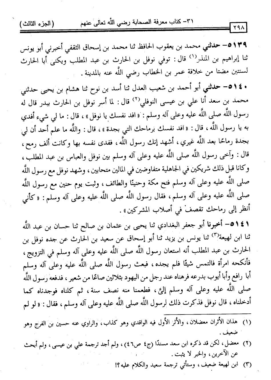 5140 - حَدَّثَنِي أَبُو أَحْمَدَ بْنُ شُعَيْبٍ الْعَدْلُ ، ثنا أَسَدُ بْنُ نُوحٍ ، ثنا هِشَامُ بْنُ يَحْيَى ، حَدَّثَنِي مُحَمَّدُ بْنُ سَعْدٍ ، أَنَا عَلِيُّ بْنُ عِيسَى النَّوْفَلِيُّ قَالَ: لَمَّا أُسِرَ نَوْفَلُ بْنُ الْحَارِثِ بِبَدْرٍ ، قَالَ لَهُ رَسُولُ اللَّهِ صَلَّى اللَّهُ عَلَيْهِ وَسَلَّمَ: " افْدِ نَفْسَكَ يَا نَوْفَلُ " ، قَالَ: مَا لِي شَيْءٌ أَفْدِي بِهِ يَا رَسُولَ اللَّهِ ، قَالَ: " افْدِ نَفْسَكَ بِرِمَاحِكَ الَّتِي بِجُدَّةَ " قَالَ: وَاللَّهِ مَا عَلِمَ أَحَدٌ أَنَّ لِي بِجُدَّةَ رِمَاحًا بَعْدَ اللَّهِ غَيْرِي ، أَشْهَدُ أَنَّكَ رَسُولُ اللَّهِ ، فَفَدَى نَفْسَهُ بِهَا ، وَكَانَتْ أَلْفَ رُمْحٍ ، قَالَ: وَآخَى رَسُولُ اللَّهِ صَلَّى اللَّهُ عَلَيْهِ وَسَلَّمَ بَيْنَ نَوْفَلٍ وَالْعَبَّاسِ بْنِ عَبْدِ الْمُطَّلِبِ ، وَكَانَا قَبْلَ ذَلِكَ شَرِيكَيْنِ فِي الْجَاهِلِيَّةِ مُتَفَاوِضَيْنِ فِي الْمَالَيْنِ مُتَحَابَّيْنِ ، وَشَهِدَ نَوْفَلٌ مَعَ رَسُولِ اللَّهِ صَلَّى اللَّهُ عَلَيْهِ وَسَلَّمَ فَتْحَ مَكَّةَ وَحُنَيْنًا وَالطَّائِفَ ، وَثَبَتَ يَوْمَ حُنَيْنٍ مَعَ رَسُولِ اللَّهِ صَلَّى اللَّهُ عَلَيْهِ وَسَلَّمَ ، فَقَالَ رَسُولُ اللَّهِ صَلَّى اللَّهُ عَلَيْهِ وَسَلَّمَ: " كَأَنِّي أَنْظُرُ إِلَى رِمَاحِكَ تُقْصَفُ فِي أَصْلَابِ الْمُشْرِكِينَ "
