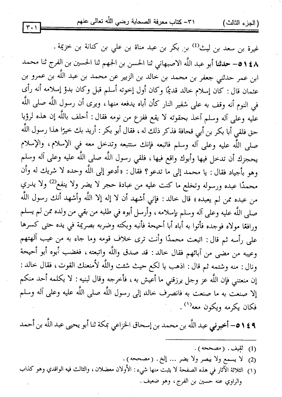 5148 - حَدَّثَنَا أَبُو عَبْدِ اللَّهِ الْأَصْبَهَانِيُّ ، ثنا الْحَسَنُ بْنُ الْجَهْمِ ، ثنا الْحُسَيْنُ بْنُ الْفَرَجِ ، ثنا مُحَمَّدُ بْنُ عُمَرَ ، حَدَّثَنِي جَعْفَرُ بْنُ مُحَمَّدِ بْنِ خَالِدِ بْنِ الزُّبَيْرِ ، عَنْ مُحَمَّدِ بْنِ عَبْدِ اللَّهِ بْنِ عَمْرِو بْنِ عُثْمَانَ ، قَالَ: كَانَ إِسْلَامُ خَالِدٍ قَدِيمًا وَكَانَ أَوَّلَ إِخْوَتِهِ أَسْلَمَ قَبْلَ ، وَكَانَ بَدْءُ إِسْلَامِهِ أَنَّهُ رَأَى فِي النَّوْمَ أَنَّهُ وَقَفَ بِهِ عَلَى شَفِيرِ النَّارِ كَأَنَّ أَبَاهُ يَدْفَعُهُ مِنْهَا ، وَيَرَى أَنَّ رَسُولَ اللَّهِ صَلَّى اللَّهُ عَلَيْهِ وَسَلَّمَ آخِذٌ بِحِقْوَتِهِ لَا يَقَعُ ، فَفَزِعَ مِنْ نَوْمِهِ ، فَقَالَ: أَحْلِفُ بِاللَّهِ أَنَّ هَذِهِ لَرُؤْيَا حَقٌّ ، فَلَقِيَ أَبَا بَكْرِ بْنَ أَبِي قُحَافَةَ فَذَكَرَ ذَلِكَ لَهُ ، فَقَالَ أَبُو بَكْرٍ: أُرِيدُ بِكَ خَيْرًا ، هَذَا رَسُولُ اللَّهِ صَلَّى اللَّهُ عَلَيْهِ وَسَلَّمَ ، فَاتَّبِعْهُ فَإِنَّكَ سَتَتْبَعُهُ وَتَدْخُلَ مَعَهُ فِي الْإِسْلَامِ ، وَالْإِسْلَامُ يَحْجِزُكَ أَنْ تَدْخُلَ فِيهَا وَأَبُوكَ وَاقِعٌ فِيهَا ، فَلَقِيَ رَسُولَ اللَّهِ صَلَّى اللَّهُ عَلَيْهِ وَسَلَّمَ وَهُوَ بِأَجْيَادَ ، فَقَالَ: يَا مُحَمَّدُ ، إِلَامَ تَدْعُو ؟ فَقَالَ: " أَدْعُو إِلَى اللَّهِ وَحْدَهُ لَا شَرِيكَ لَهُ ، وَأَنَّ مُحَمَّدًا عَبْدُهُ وَرَسُولُهُ ، وَتَخْلَعُ مَا كُنْتَ عَلَيْهِ مِنْ عُبَادَةِ حَجَرٍ لَا يَضُرُّ وَلَا يَنْفَعُ ، وَلَا يَدْرِي مَنْ عَبَدَهُ مِمَّنْ لَمْ يَعْبُدَهُ " قَالَ خَالِدٌ: فَإِنِّي أَشْهَدُ أَنَّ لَا إِلَهَ إِلَّا اللَّهُ ، وَأَشْهَدُ إِنَّكَ رَسُولُ اللَّهِ صَلَّى اللَّهُ عَلَيْهِ وَسَلَّمَ بِإِسْلَامِهِ ، وَأَرْسَلَ أَبُوهُ فِي طَلَبِهِ مَنْ بَقِيَ مِنْ وَلَدِهِ مِمَّنْ لَمْ يُسْلِمْ وَرَافِعًا مَوْلَاهُ ، فَوَجَدَهُ فَأَتَوْا بِهِ أَبَاهُ أَبَا أُحَيْحَةَ فَأَنَّبَهُ وَبَكَّتَهُ وَضَرَبَهُ بِصَرِيمَةٍ فِي يَدِهِ حَتَّى كَسَرَهَا عَلَى رَأْسِهِ ، ثُمَّ قَالَ: اتَّبَعْتَ مُحَمَّدًا وَأَنْتَ تَرَى خِلَافَ قَوْمِهِ وَمَا جَاءَ بِهِ مِنْ عَيْبِ آلِهَتِهِمْ وَعَيْبَةِ مَنْ مَضَى مِنْ آبَائِهِمْ ، فَقَالَ خَالِدٌ: قَدْ صَدَقَ وَاللَّهِ وَاتَّبَعْتُهُ ، فَغَضِبَ أَبُوهُ أَبُو أُحَيْحَةَ وَنَالَ مِنْهُ وَشَتَمَهُ ، ثُمَّ قَالَ: اذْهَبْ يَا لُكَعُ حَيْثُ شِئْتَ وَاللَّهِ لَأَمْنَعَنَّكَ الْقُوتَ ، فَقَالَ خَالِدٌ: إِنْ مَنَعْتَنِي فَإِنَّ اللَّهَ عَزَّ وَجَلَّ يَرْزُقَنِي مَا أَعِيشُ بِهِ فَأَخْرَجَهُ وَقَالَ لِبَنِيهِ: لَا يُكَلِّمُهُ أَحَدٌ مِنْكُمْ إِلَّا صَنَعْتَ بِهِ مَا صَنَعْتَ بِهِ ، فَانْصَرَفَ خَالِدٌ إِلَى رَسُولِ اللَّهِ صَلَّى اللَّهُ عَلَيْهِ وَسَلَّمَ فَكَانَ يُكْرِمُهُ وَيَكُونُ مَعَهُ