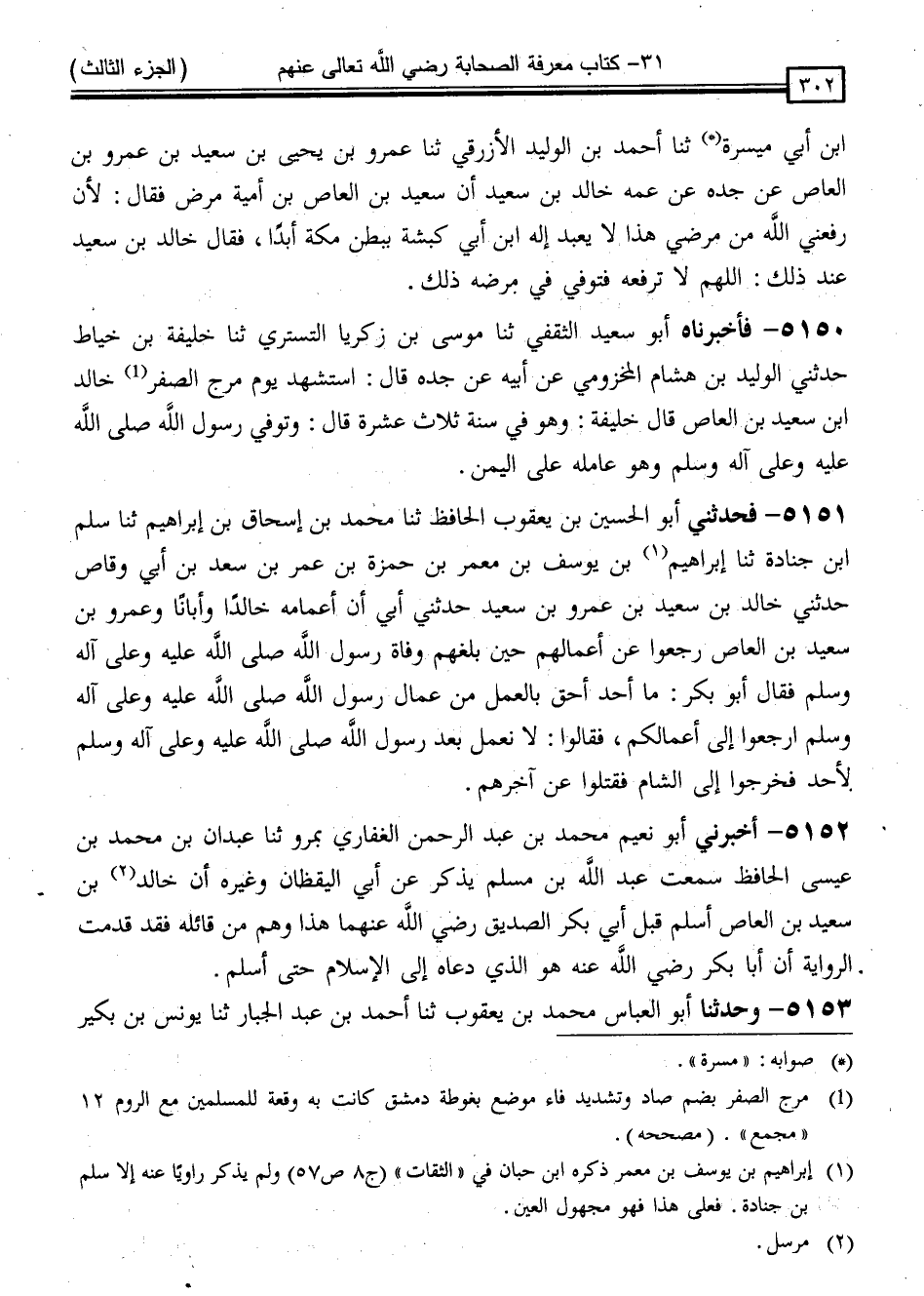 5151 - فَحَدَّثَنِي أَبُو الْحُسَيْنِ بْنُ يَعْقُوبَ الْحَافِظُ ، ثنا مُحَمَّدُ بْنُ إِسْحَاقَ بْنِ إِبْرَاهِيمَ ، ثنا سَلْمُ بْنُ جُنَادَةَ ، ثنا إِبْرَاهِيمُ بْنُ يُوسُفَ بْنِ مَعْمَرِ بْنِ حَمْزَةَ بْنِ عُمَرَ بْنِ سَعْدِ بْنِ أَبِي وَقَّاصٍ ، حَدَّثَنِي خَالِدُ بْنُ سَعِيدِ بْنِ عَمْرِو بْنِ سَعِيدٍ ، حَدَّثَنِي أَبِي ، أَنَّ أَعْمَامَهُ خَالِدًا ، وَأَبَانَا وَعَمْرَو بْنَ سَعِيدِ بْنِ الْعَاصِ رَجَعُوا عَنْ أَعْمَالِهِمْ ، حِينَ بَلَغَهُمْ وَفَاةُ رَسُولِ اللَّهِ صَلَّى اللَّهُ عَلَيْهِ وَسَلَّمَ ، فَقَالَ أَبُو بَكْرٍ: " مَا أَحَدٌ أَحَقَّ بِالْعَمَلِ مِنْ عُمَّالِ رَسُولِ اللَّهِ صَلَّى اللَّهُ عَلَيْهِ وَسَلَّمَ ارْجِعُوا إِلَى أَعْمَالِكُمْ " ، فَقَالُوا: لَا نَعْمَلُ بَعْدَ رَسُولِ اللَّهِ صَلَّى اللَّهُ عَلَيْهِ وَسَلَّمَ لِأَحَدٍ ، فَخَرَجُوا إِلَى الشَّامِ فَقُتِلُوا عَنْ آخِرُهُمْ