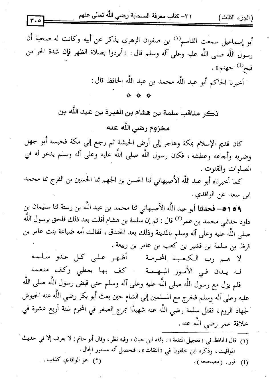 5159 - فَحَدَّثَنَا أَبُو عَبْدِ اللَّهِ الْأَصْبَهَانِيُّ ، ثنا مُحَمَّدُ بْنُ عَبْدِ اللَّهِ بْنِ رُسْتَةَ ، ثنا سُلَيْمَانُ بْنُ دَاوُدَ ، حَدَّثَنِي مُحَمَّدُ بْنُ عُمَرَ قَالَ: " ثُمَّ إِنَّ سَلَمَةَ بْنَ هِشَامٍ أَفْلَتَ بَعْدَ ذَلِكَ ، فَلَحِقَ بِرَسُولِ اللَّهِ صَلَّى اللَّهُ عَلَيْهِ وَسَلَّمَ بِالْمَدِينَةِ ، وَذَلِكَ بَعْدَ الْخَنْدَقِ فَقَالَتْ أُمُّهُ ضُبَاعَةُ بِنْتُ عَامِرِ بْنِ قَرَظِ بْنِ سَلَمَةَ بْنِ قُشَيْرِ بْنِ كَعْبِ بْنِ عَامِرِ بْنِ رَبِيعَةَ: