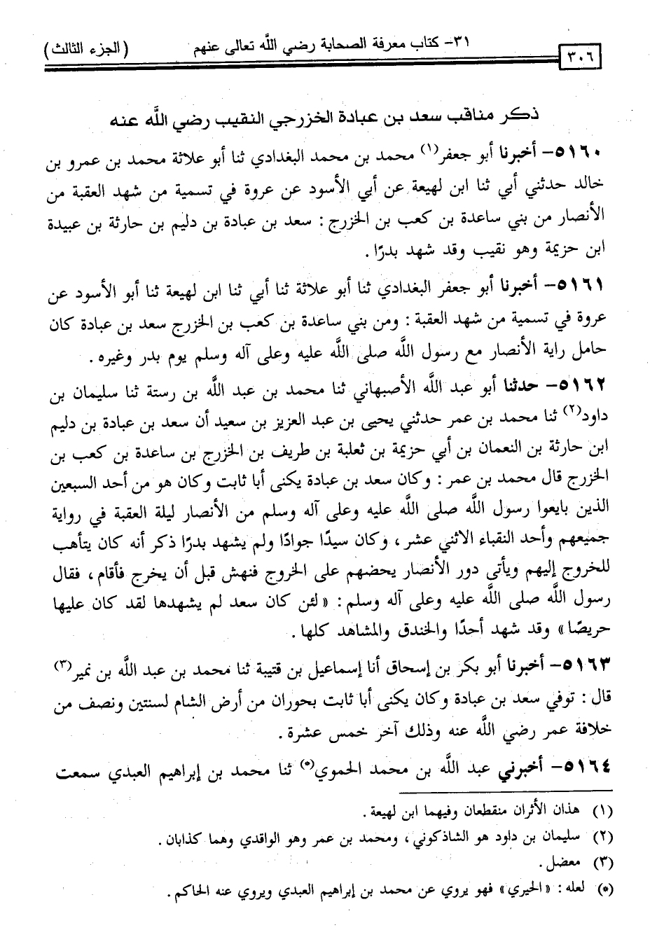 5160 - أَخْبَرَنَا أَبُو جَعْفَرٍ مُحَمَّدُ بْنُ مُحَمَّدٍ الْبَغْدَادِيُّ ، ثنا أَبُو عُلَاثَةَ مُحَمَّدُ بْنُ عَمْرِو بْنِ خَالِدٍ ، حَدَّثَنِي أَبِي ، ثنا ابْنُ لَهِيعَةَ ، عَنْ أَبِي الْأَسْوَدِ ، عَنْ عُرْوَةَ " فِي تَسْمِيَةِ مَنْ شَهِدَ الْعَقَبَةَ مِنَ الْأَنْصَارِ مِنْ بَنِي سَاعِدَةَ بْنِ كَعْبِ بْنِ الْخَزْرَجِ سَعْدُ بْنُ عُبَادَةَ بْنِ دُلَيْمِ بْنِ حَارِثَةَ بْنِ عُبَيْدَةَ بْنِ حُزَيْمَةَ وَهُوَ نَقِيبٌ وَقَدْ شَهِدَ بَدْرًا "