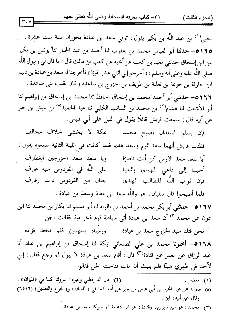 5168 - أَخْبَرَنَا مُحَمَّدُ بْنُ عَلِيٍّ الصَّنْعَانِيُّ بِمَكَّةَ ، ثنا إِسْحَاقُ بْنُ إِبْرَاهِيمَ بْنِ عَبَّادٍ ، أَنَا عَبْدُ الرَّزَّاقِ ، عَنْ مَعْمَرٍ ، عَنْ قَتَادَةَ قَالَ: " أَقَامَ سَعْدُ بْنُ عُبَادَةَ لَا يَبُولُ ثُمَّ رَجَعَ فَقَالَ: إِنِّي لَأَجِدُ فِي ظَهْرِي شَيْئًا ، فَلَمْ يَلْبَثْ أَنْ مَاتَ ، فَنَاحَتِ الْجِنُّ فَقَالُوا: -[308]-