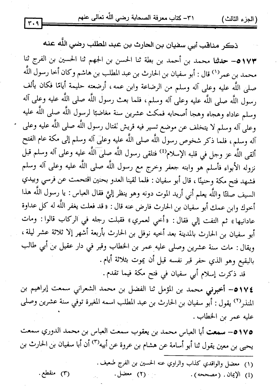 5173 - حَدَّثَنَا مُحَمَّدُ بْنُ أَحْمَدَ بْنِ بُطَّةَ ، ثنا الْحَسَنُ بْنُ الْجَهْمِ ، ثنا الْحُسَيْنُ بْنُ الْفَرَجِ ، ثنا مُحَمَّدُ بْنُ عُمَرَ قَالَ: أَبُو سُفْيَانَ بْنُ الْحَارِثِ بْنِ عَبْدِ الْمُطَّلِبِ بْنِ هَاشِمٍ وَكَانَ أَخَا رَسُولِ اللَّهِ صَلَّى اللَّهُ عَلَيْهِ وَسَلَّمَ مِنَ الرَّضَاعَةِ ، وَابْنَ عَمِّهِ أَرْضَعَتْهُ حَلِيمَةُ أَيَّامًا ، فَكَانَ يَأْلَفُ رَسُولَ اللَّهِ صَلَّى اللَّهُ عَلَيْهِ وَسَلَّمَ ، فَلَمَّا بَعَثَ رَسُولُ اللَّهِ صَلَّى اللَّهُ عَلَيْهِ وَسَلَّمَ عَادَاهُ وَهَجَاهُ وَهَجَا أَصْحَابَهُ ، فَمَكَثَ عِشْرِينَ سَنَةً مُغَاضِبًا لِرَسُولِ اللَّهِ صَلَّى اللَّهُ عَلَيْهِ وَسَلَّمَ لَا يَتَخَلَّفُ عَنْ مَوْضِعٍ تَسِيرُ فِيهِ قُرَيْشٌ لِقِتَالِ رَسُولِ اللَّهِ صَلَّى اللَّهُ عَلَيْهِ وَسَلَّمَ ، فَلَمَّا ذُكِرَ شُخُوصُ رَسُولِ اللَّهِ صَلَّى اللَّهُ عَلَيْهِ وَسَلَّمَ إِلَى مَكَّةَ عَامَ الْفَتْحِ أَلْقَى اللَّهُ عَزَّ وَجَلَّ فِي قَلْبِهِ الْإِسْلَامَ ، فَتَلَقَّى رَسُولَ اللَّهِ صَلَّى اللَّهُ عَلَيْهِ وَسَلَّمَ قَبْلَ نُزُولِهِ الْأَبْوَاءَ ، فَأَسْلَمَ هُوَ وَابْنُهُ جَعْفَرٌ ، وَخَرَجَ مَعَ رَسُولِ اللَّهِ صَلَّى اللَّهُ عَلَيْهِ وَسَلَّمَ فَشَهِدَ فَتْحَ مَكَّةَ وَحُنَيْنًا قَالَ أَبُو سُفْيَانَ: فَلَمَّا لَقِينَا الْعَدُوَّ بِحُنَيْنٍ اقْتَحَمْتُ عَنْ فَرَسِي وَبِيَدِي السَّيْفُ صَلْتًا ، وَاللَّهُ يَعْلَمُ أَنِّي أُرِيدُ الْمَوْتَ دُونَهُ وَهُوَ يَنْظُرُ إِلَيَّ ، فَقَالَ الْعَبَّاسُ: يَا رَسُولَ اللَّهِ ، هَذَا أَخُوكَ وَابْنُ عَمِّكَ أَبُو سُفْيَانَ بْنُ الْحَارِثِ فَارْضَ عَنْهُ ، قَالَ: " قَدْ فَعَلْتُ ، يَغْفِرُ اللَّهُ لَهُ كُلَّ عَدَاوَةٍ عَادَانِيهَا " ثُمَّ الْتَفَتَ إِلَيَّ فَقَالَ: " أَخِي لَعَمْرِي " فَقَبَّلْتُ رِجْلَهُ فِي الرِّكَابِ ، قَالُوا: وَمَاتَ أَبُو سُفْيَانَ بْنُ الْحَارِثِ بِالْمَدِينَةِ بَعْدَ أَخِيهِ نَوْفَلِ بْنِ الْحَارِثِ بِأَرْبَعَةَ أَشْهُرٍ إِلَّا ثَلَاثَةَ عَشَرَ لَيْلَةً ، وَيُقَالُ: مَاتَ سَنَةَ عِشْرِينَ وَصَلَّى عَلَيْهِ عُمَرُ بْنُ الْخَطَّابِ ، وَقُبِرَ فِي دَارِ عَقِيلِ بْنِ أَبِي طَالِبٍ بِالْبَقِيعِ ، وَهُوَ الَّذِي حَفَرَ قَبْرَ نَفْسِهِ قَبْلَ أَنْ يَمُوتَ بِثَلَاثَةِ أَيَّامٍ " قَدْ ذَكَرْتُ إِسْلَامَ أَبِي سُفْيَانَ فِي فَتْحِ مَكَّةَ فِيمَا تَقَدَّمَ "
