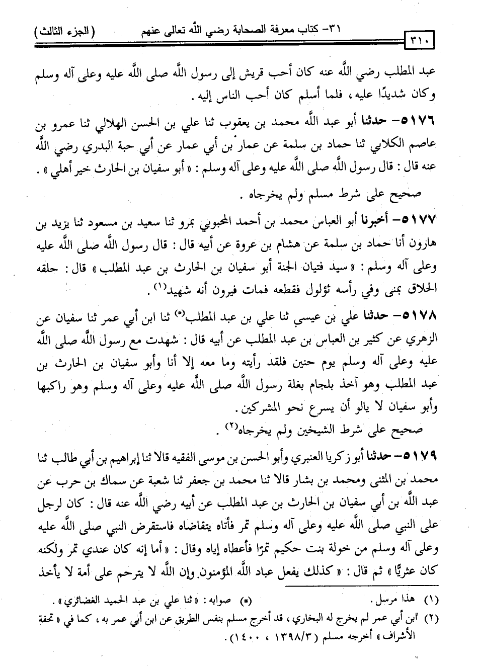 5177 - أَخْبَرَنَا أَبُو الْعَبَّاسِ مُحَمَّدُ بْنُ أَحْمَدَ الْمَحْبُوبِيُّ بِمَرْوَ ، ثنا سَعِيدُ بْنُ مَسْعُودٍ ، ثنا يَزِيدُ بْنُ هَارُونَ ، أَنَا حَمَّادُ بْنُ سَلَمَةَ ، عَنْ هِشَامِ بْنِ عُرْوَةَ ، عَنْ أَبِيهِ قَالَ: قَالَ رَسُولُ اللَّهِ صَلَّى اللَّهُ عَلَيْهِ وَسَلَّمَ: " سَيِّدُ فَتَيَانِ الْجَنَّةِ أَبُو سُفْيَانَ بْنُ الْحَارِثِ بْنِ عَبْدِ الْمُطَّلِبِ " قَالَ: " حَلَقُهُ الْحَلَّاقُ بِمِنًى وَفِي رَأْسِهِ ثُؤلُولٌ فَقَطَعَهُ فَمَاتَ فَيُرَوْنَ أَنَّهُ شَهِيدٌ "